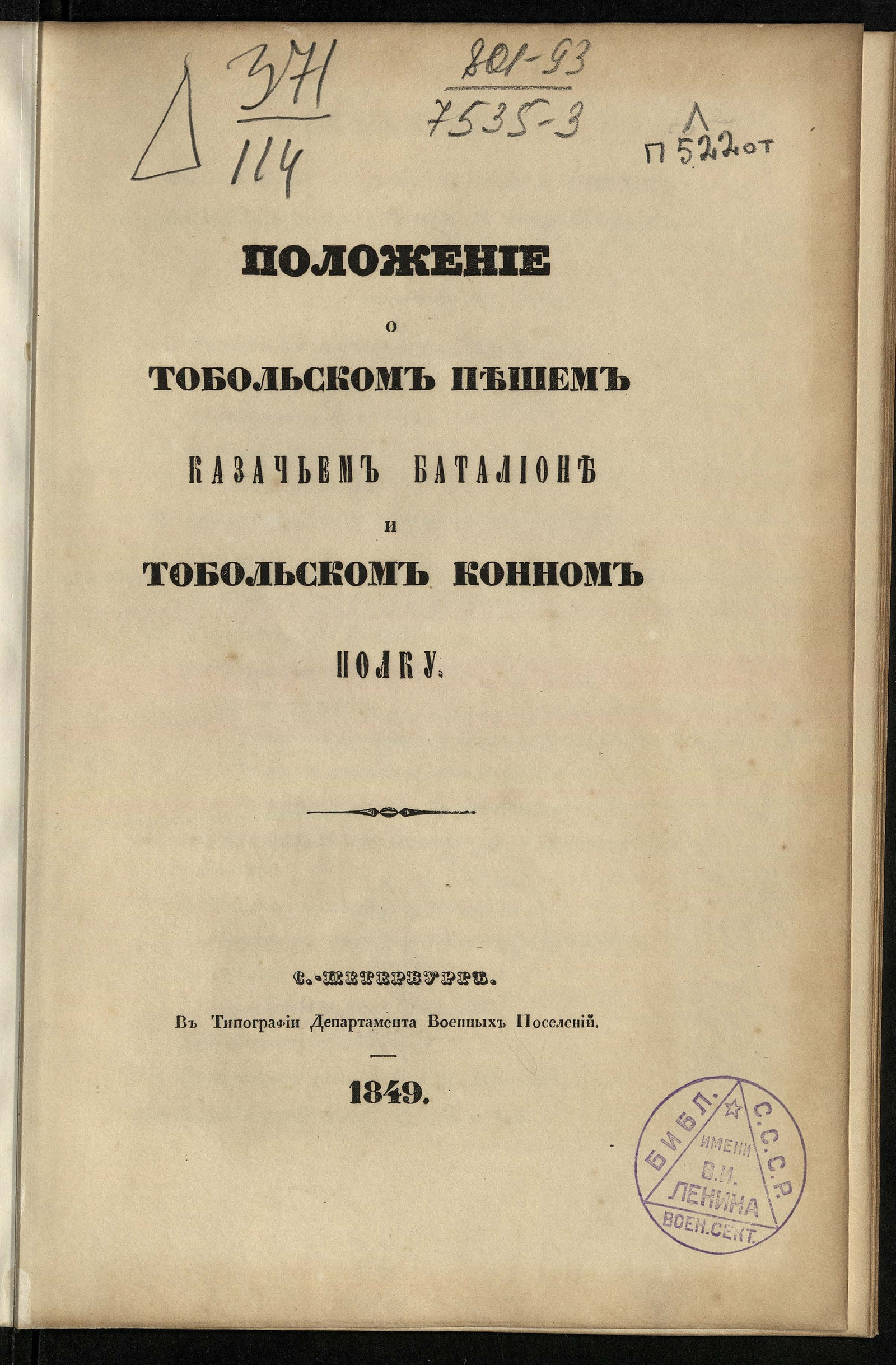 Изображение книги Положение о Тобольском пешем казачьем батальоне и Тобольском конном полку Открыть цифровую копию Показать в реестре
