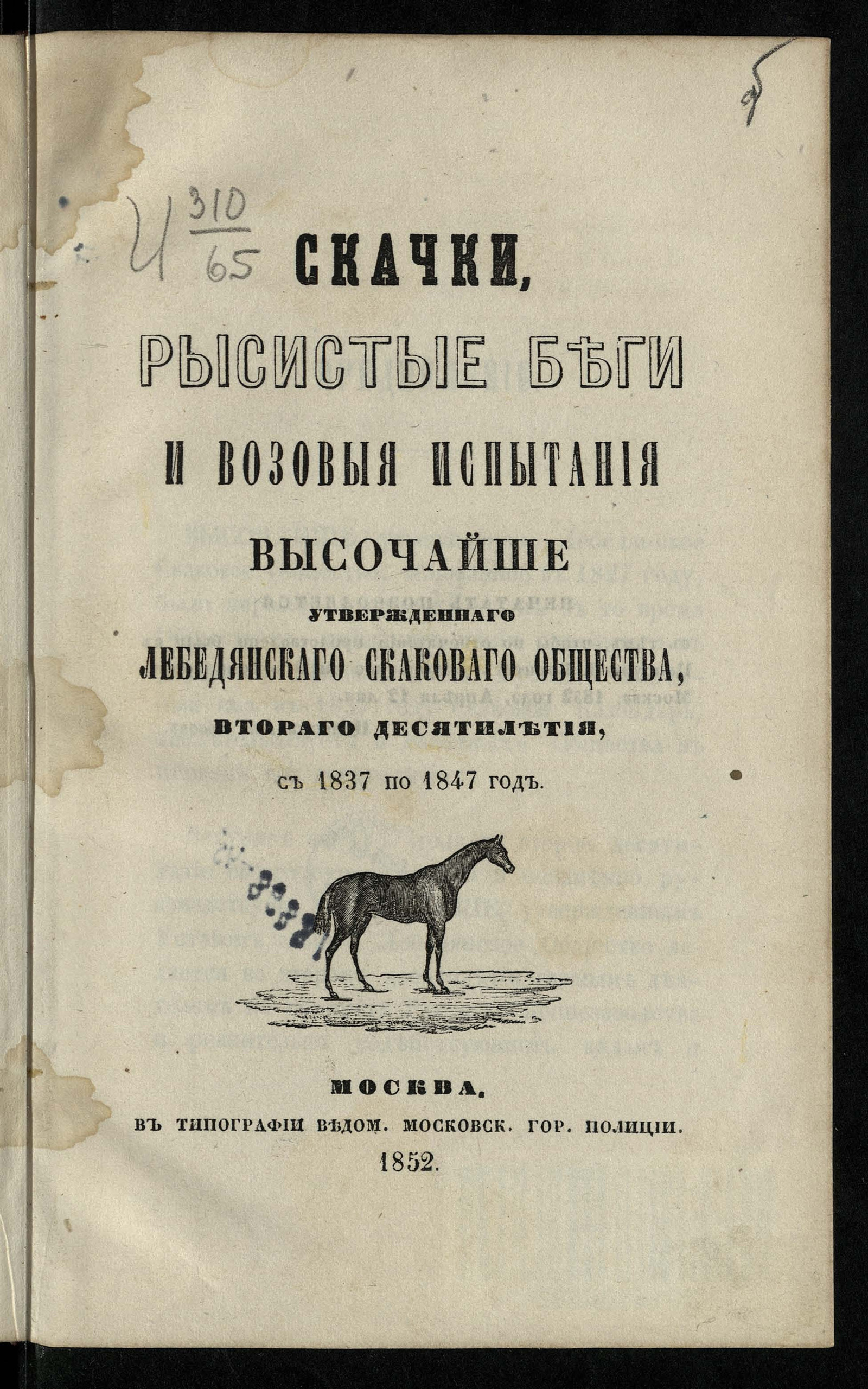 Скачки, рысистые беги и возовые испытания Лебедянскаго скаковаго общества втораго десятилетия, с 1837 по 1847 год