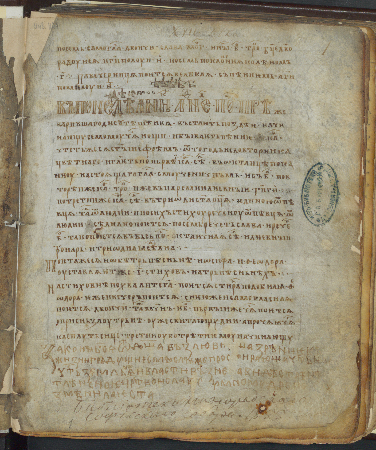 Дополнительные элементы оформления: Инициалы с элементами тератологического стиля. Материал листа источника: Пергамен. Переплет: Доски в коже. Тип письма: Устав. Фрагментарность: Без начала и конца.