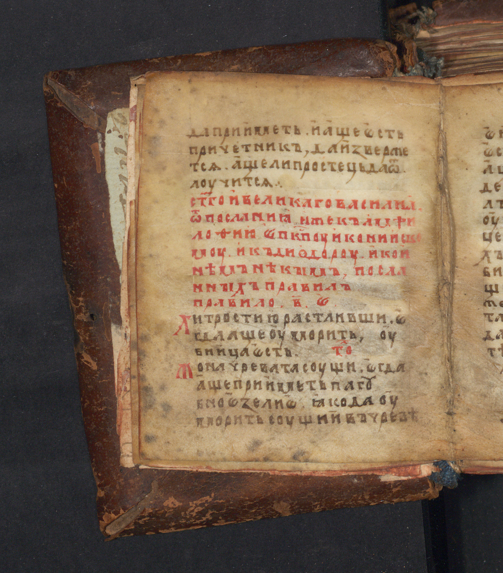 Дополнительные элементы оформления: Заставка плетеного орнамента в красках, инициалы с элементами старовизантийского орнамента киноварью и красками. Материал листа источника: Пергамен. Переплет: Доски в коже, с металлической застежкой. Тип письма: Полуустав. Фрагментарность: Без начала, утрата листов в середине блока.