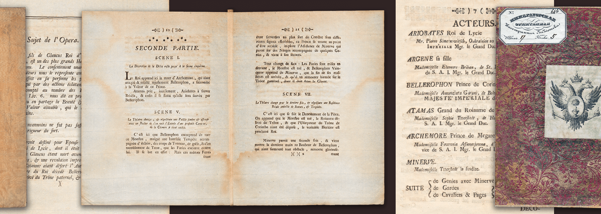 Издание представляет либретто оперы «Беллерофонт», посвящённой герою древнегреческого мифа. Это произведение написал флорентийский драматург Джузеппе Бонекки специально для постановки в ораниенбаумской резиденции великого князя Петра Фёдоровича, будущего императора Петра III. Последний распорядился обустроить в дворцовом комплексе оперный театр (один из первых в России), который располагался в Картинном доме Нижнего парка, вместе с Кунсткамерой и художественной коллекцией.