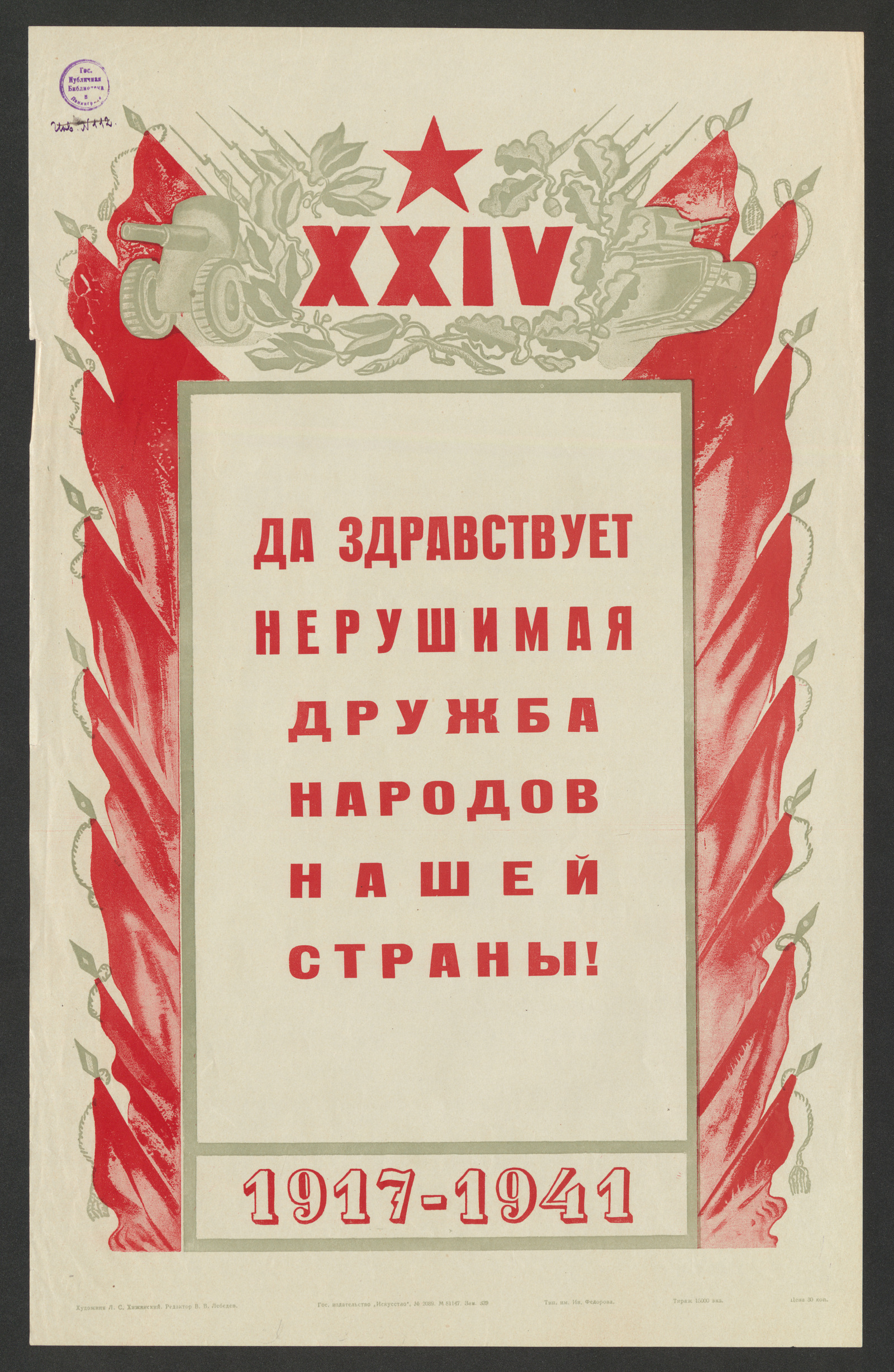 Да здравствует нерушимая дружба народов нашей страны! 1917-1941: [призыв] / редактор Владимир Васильевич Лебедев; художник Леонид Семенович Хижинский