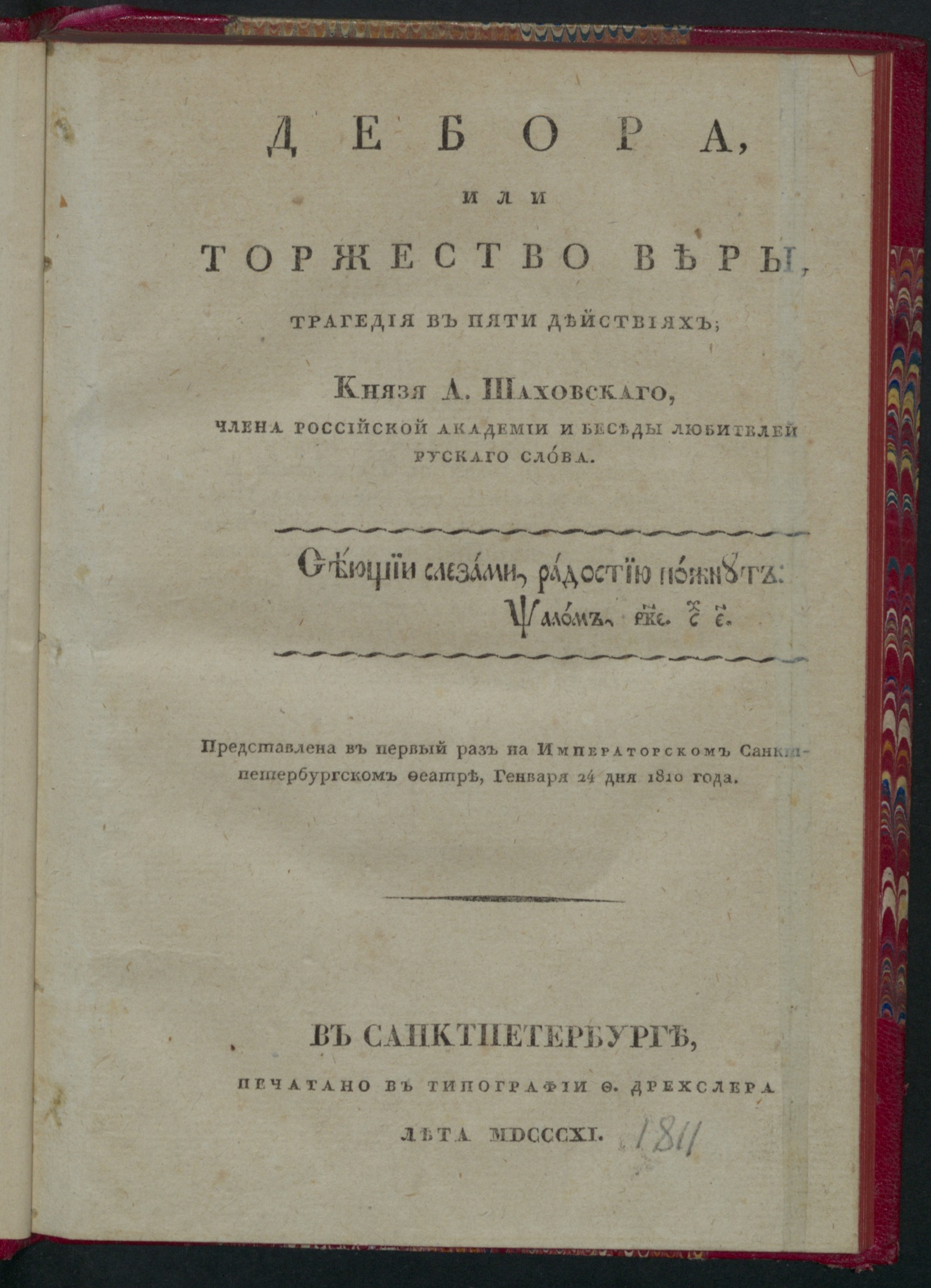 ИздательствоДебора, или Торжество веры, : трагедия в пяти действиях; = Торжество веры / князя А. Шаховскаго, члена Российской академии и Беседы любителей рускаго слова.; Представлена в первый раз на Императорском Санктпетербургском феатре, генваря 24 дня 1810 года