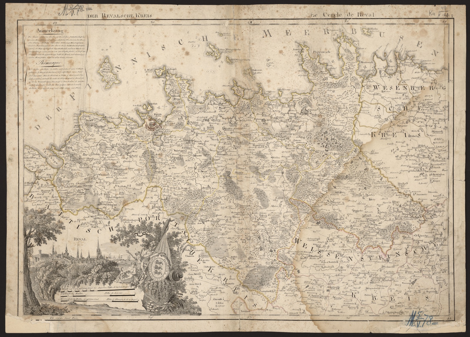 Гравированная административная карта Ревельского уезда. Картографическая сетка. Долгота от Ферро. Заглавие над верхней рамкой. Над верх. рамкой справа «N 1». Масштабные линейки в художественном сюжетном картуше с видом города и мифологическими героями. Бумага верже с филигранью. Сохранность плохая, общее загрязнение и помятость, края ветхие, следы воздействия влаги. Пометы на лицевой и обратной стороне листа (карандаш, шариковая ручка). Штемпель Российской государственной библиотеки на обратной стороне.
