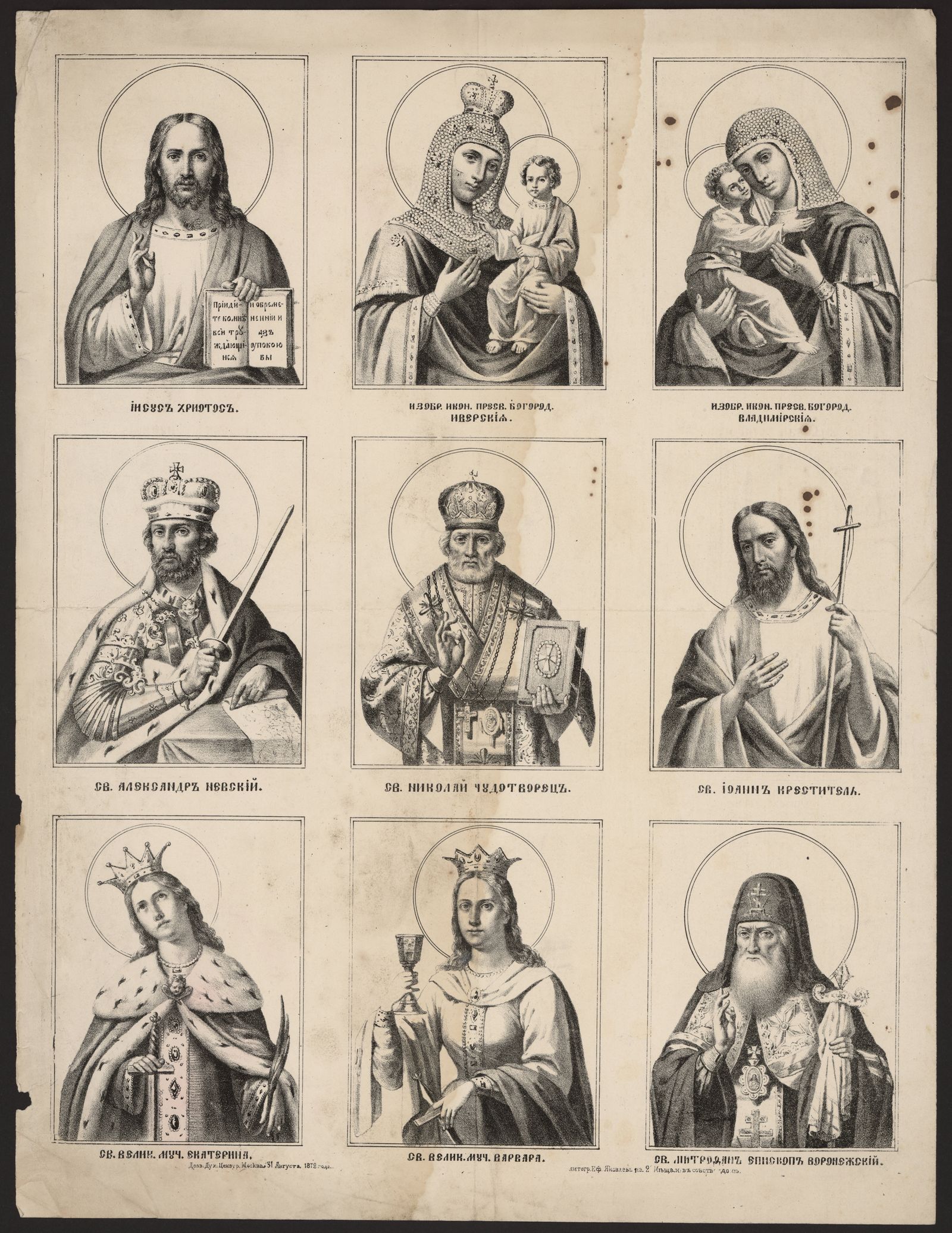 Издательство[Девятичастное изображение икон Пресвятой Богородицы, Иисуса Христа и святых Александра Невского, Николая Чудотворца, Иоанна Крестителя, Екатерины, Варвары, Митрофана Воронежского]: [лубок]