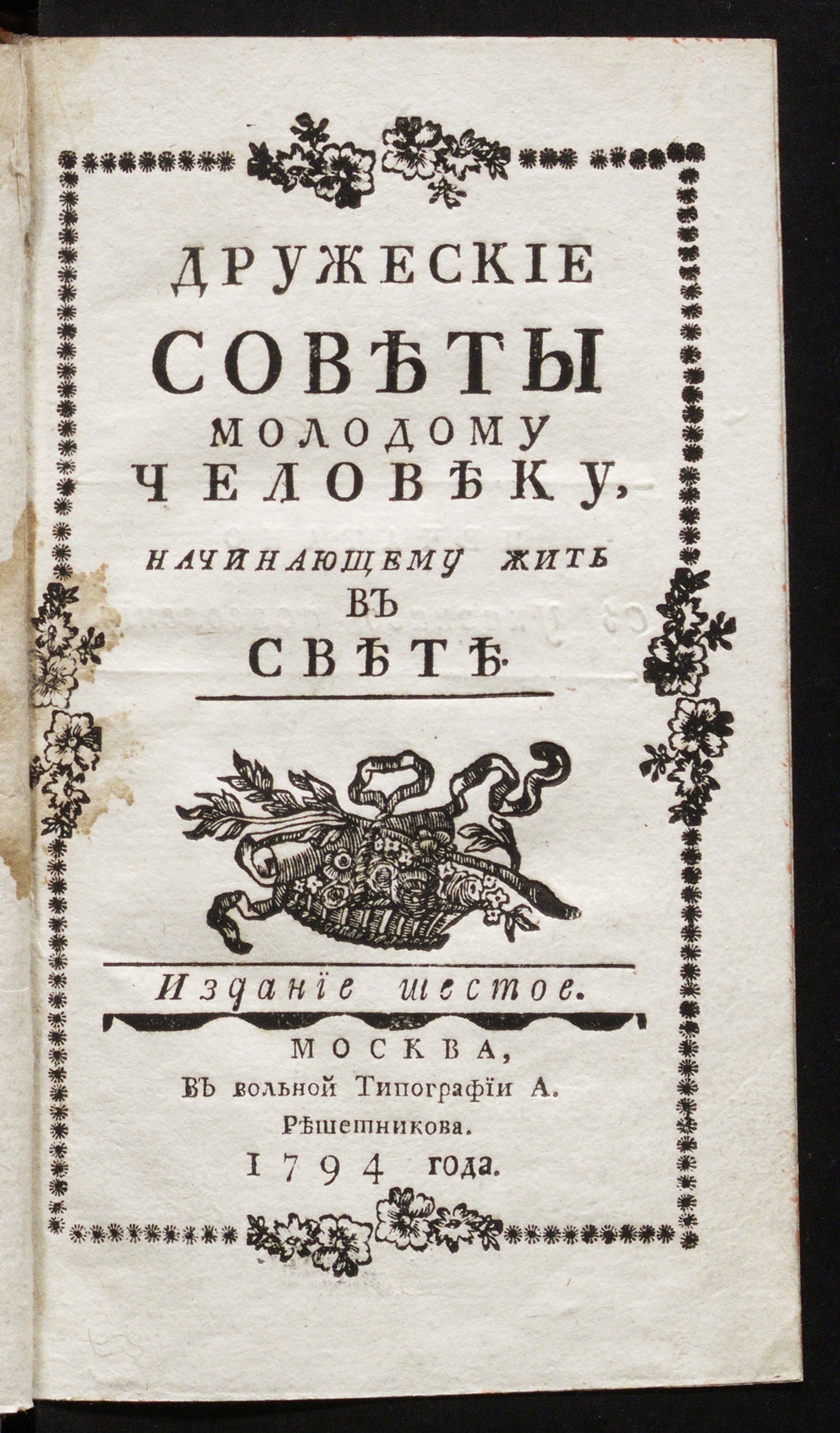 ИздательствоДружеские советы молодому человеку, начинающему жить в свете. — Издание шестое