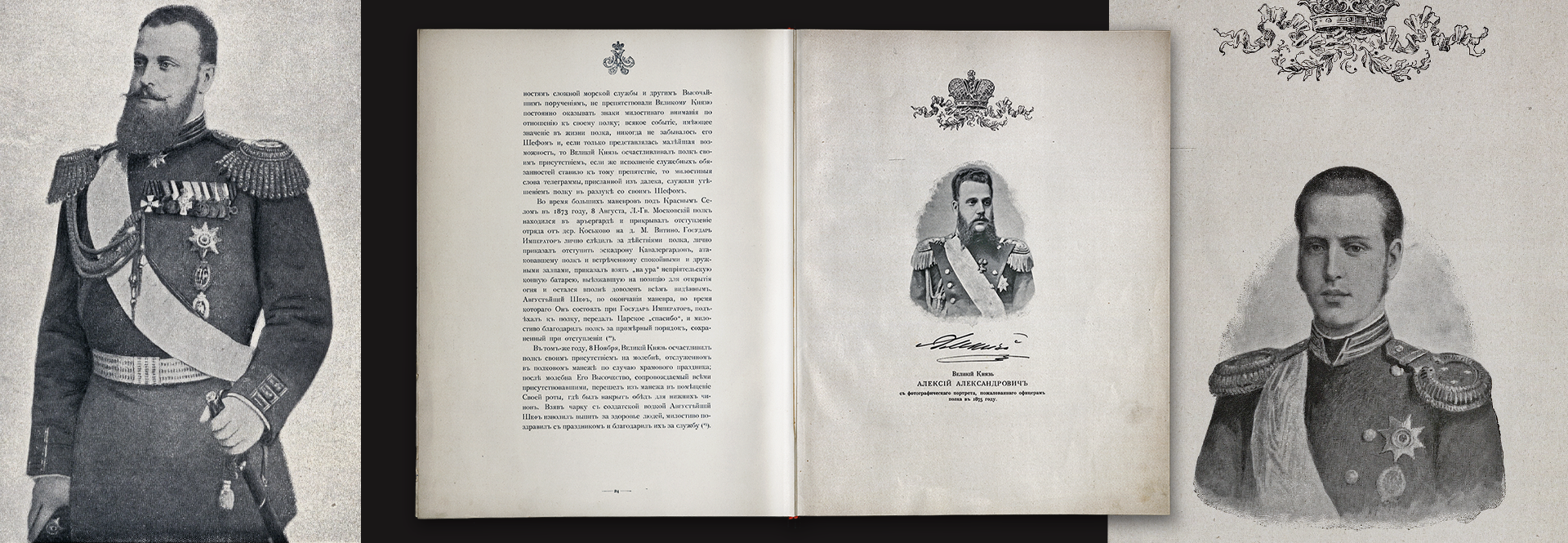 Узнать Алексея Александровича с другой стороны позволяет изданная на средства офицеров и солдат Лейб-гвардейского Московского полка книга, выпущенная к юбилею шефа полка в 1900 году. Она рассказывает об участии великого князя в развитии русского флота и в войнах — прежде всего русско-турецкой, где Алексей Александрович проявил себя как настоящий воин и командир. Именно от имени командира роты этого полка капитана Иосифа Михайловича Старковского (1860–после 1917) и составлено жизнеописание великого князи. Это издание — памятник самым счастливым и благодатным годам его жизни.