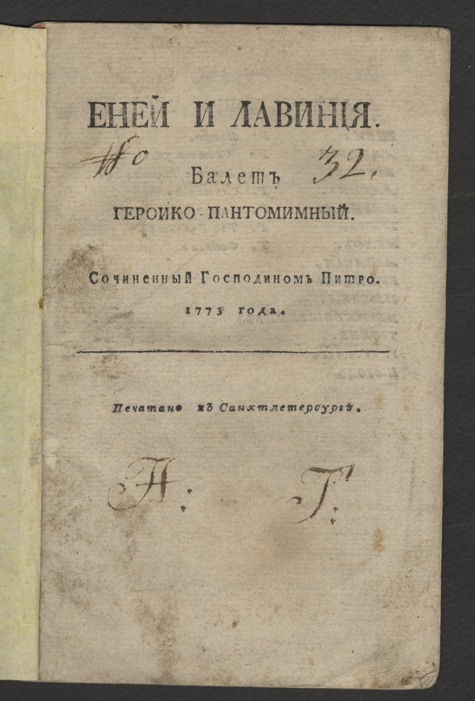ИздательствоЕней и Лавиния. : Балет героико-пантомимный. / Сочиненный господином Питро. 1773 года