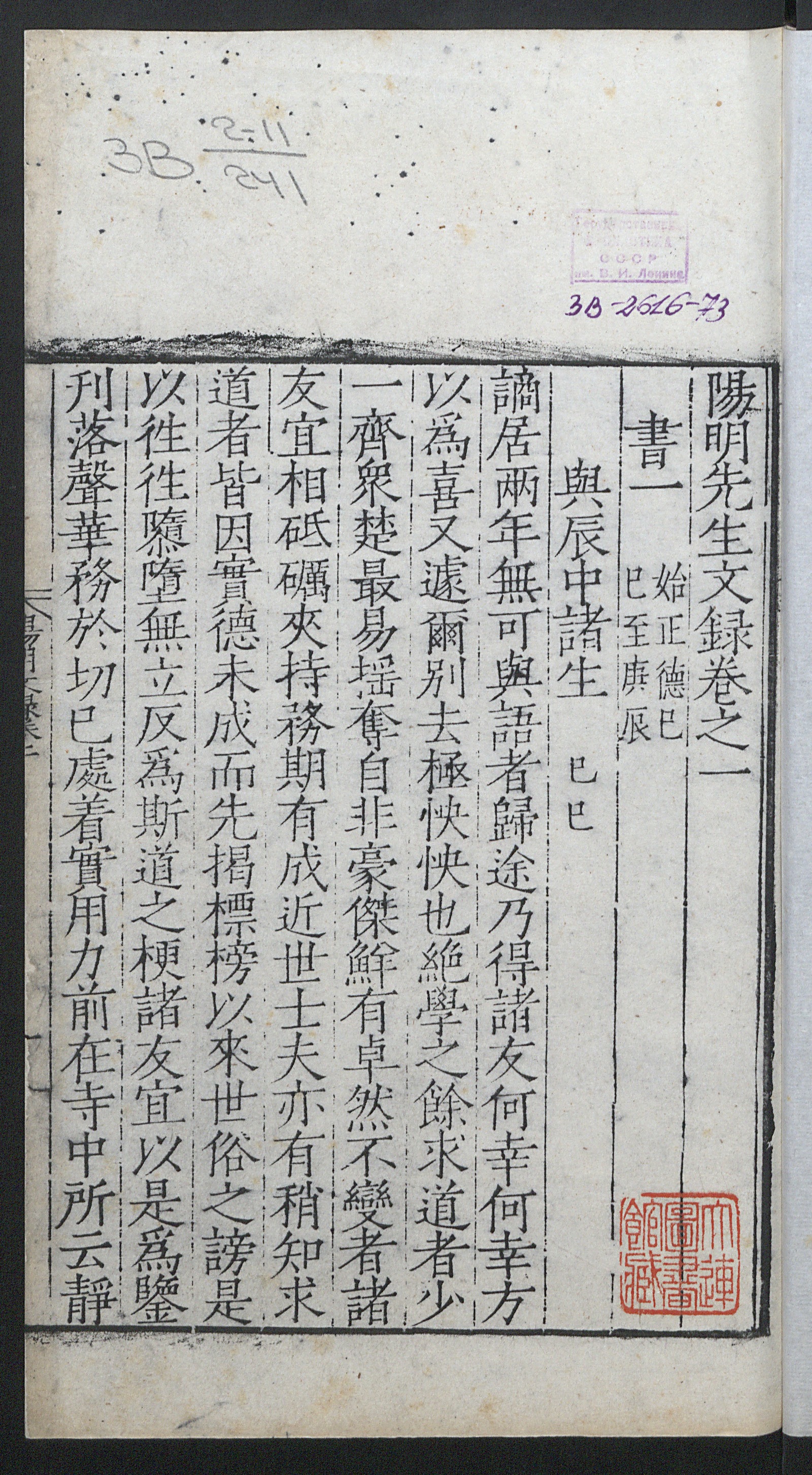 Издательство陽明先生文錄: [全二十四册] / [王陽明撰]. [Т. 4]. Философские сочинения Ван Янмина. Цзюань 2, [ч. 2]. 陽明先生文錄·卷之二[下]. [第四册]