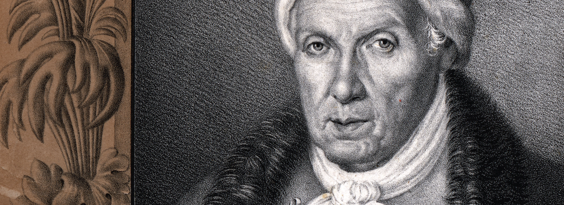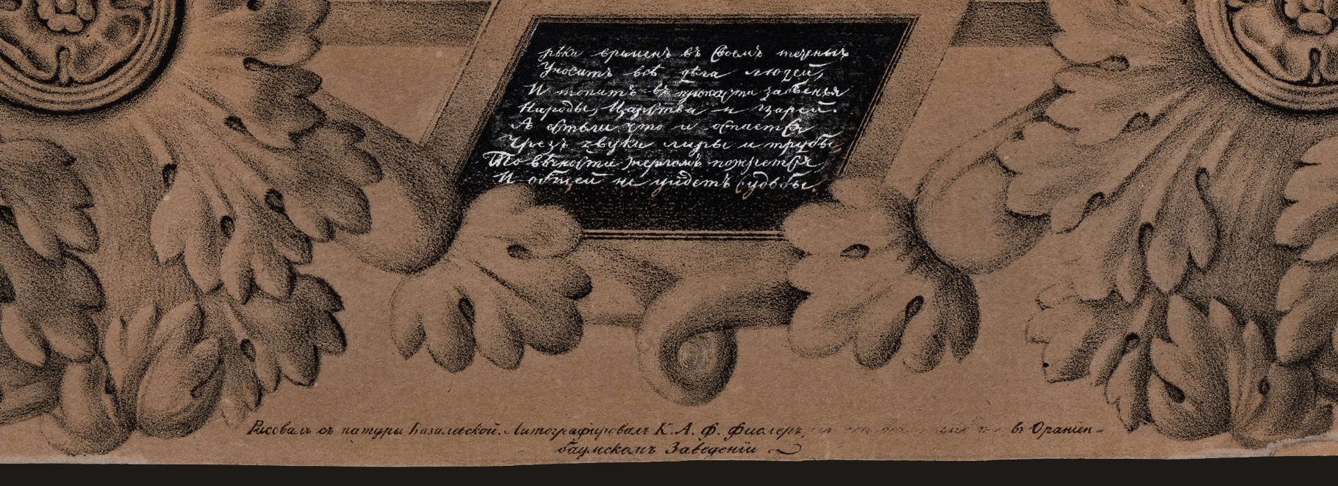 Литографированный портрет крупнейшего русского поэта Гаврилы Романовича Державина (1743-1816) работы К. А. Фислера принадлежит к самому позднему типу в иконографии Державина, в основе которого живописный портрет 1815 года, созданный художником А. А. Васильевским (1794-после 1849). Яков Карлович Грот, комментатор и составитель академического собрания сочинений Г. Р. Державина (1864-1883), так описывает живописный оригинал Васильевского: поэт на нём «в белом колпаке и в малиновом бархатном халате, опушённом соболями, в палевой фуфайке и белом платке на шее». И добавляет: «Дома Державин не любил носить парика, который надевал только для выезда или для приёма гостей, и охотнее защищал свою лысую голову колпаком; поэтому он и заказывал свои позднейшие портреты то в шапке, то в колпаке».