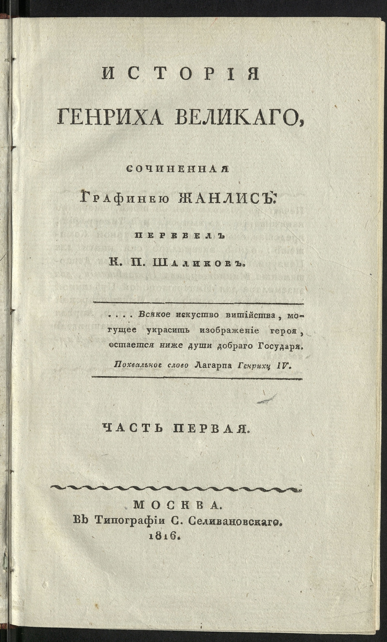 ИздательствоИстория Генриха Великаго, / Сочиненная графинею Жанлис.; Перевел к. П. Шаликов. Ч. 1.