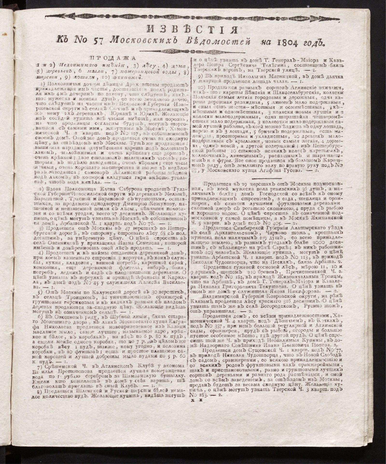 ИздательствоИзвестия к № 57 Московских ведомостей на 1804 год