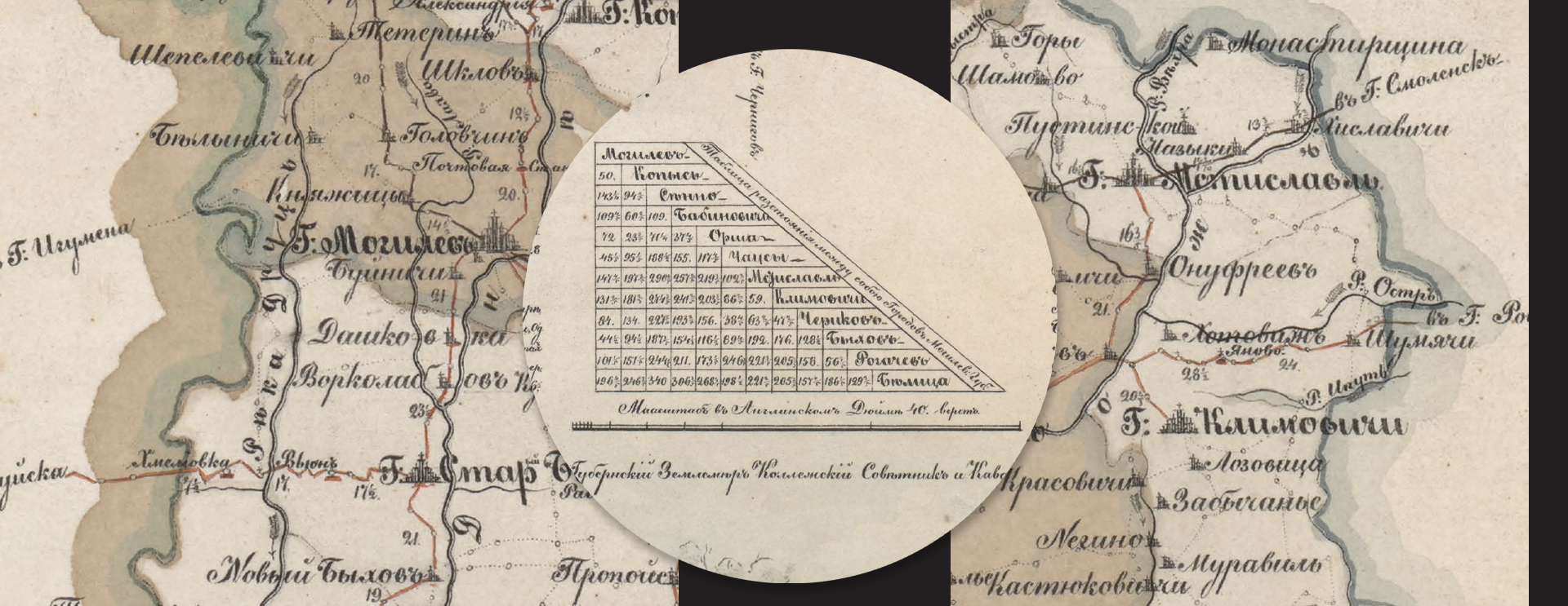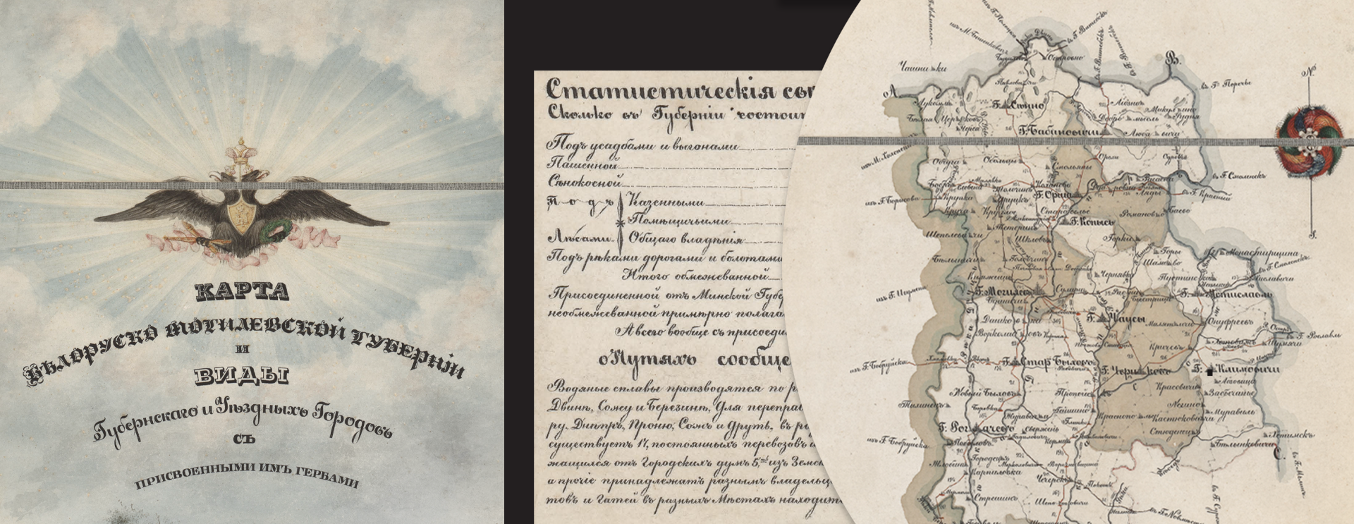 В центре расположена собственно карта губернии, выполненная по всем картографическим канонам. Она окружена перспективными видами городов. Автором карты является Игнатий Федорович Лада-Клодницкий — могилёвский губернский землемер, коллежский советник и кавалер.