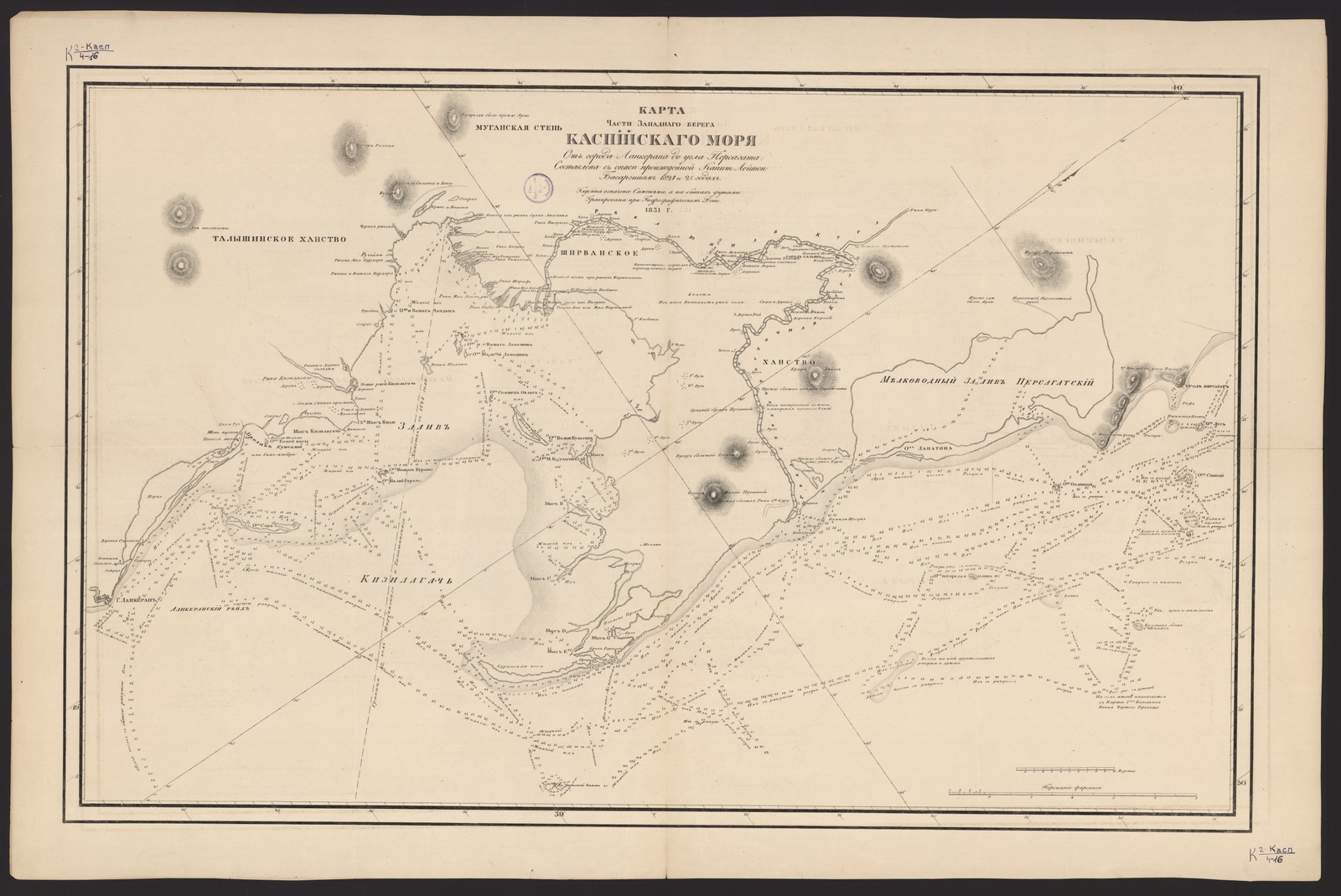 ИздательствоКаспийское море, юго-зап. часть. Карта части западнаго берега Каспийскаго моря от города Ланкерана до угла Персагата / составлена с описи произведенной капит.-лейтен. Басаргиным 1824 и 25 годах; гравирована при Гидрографическом депо