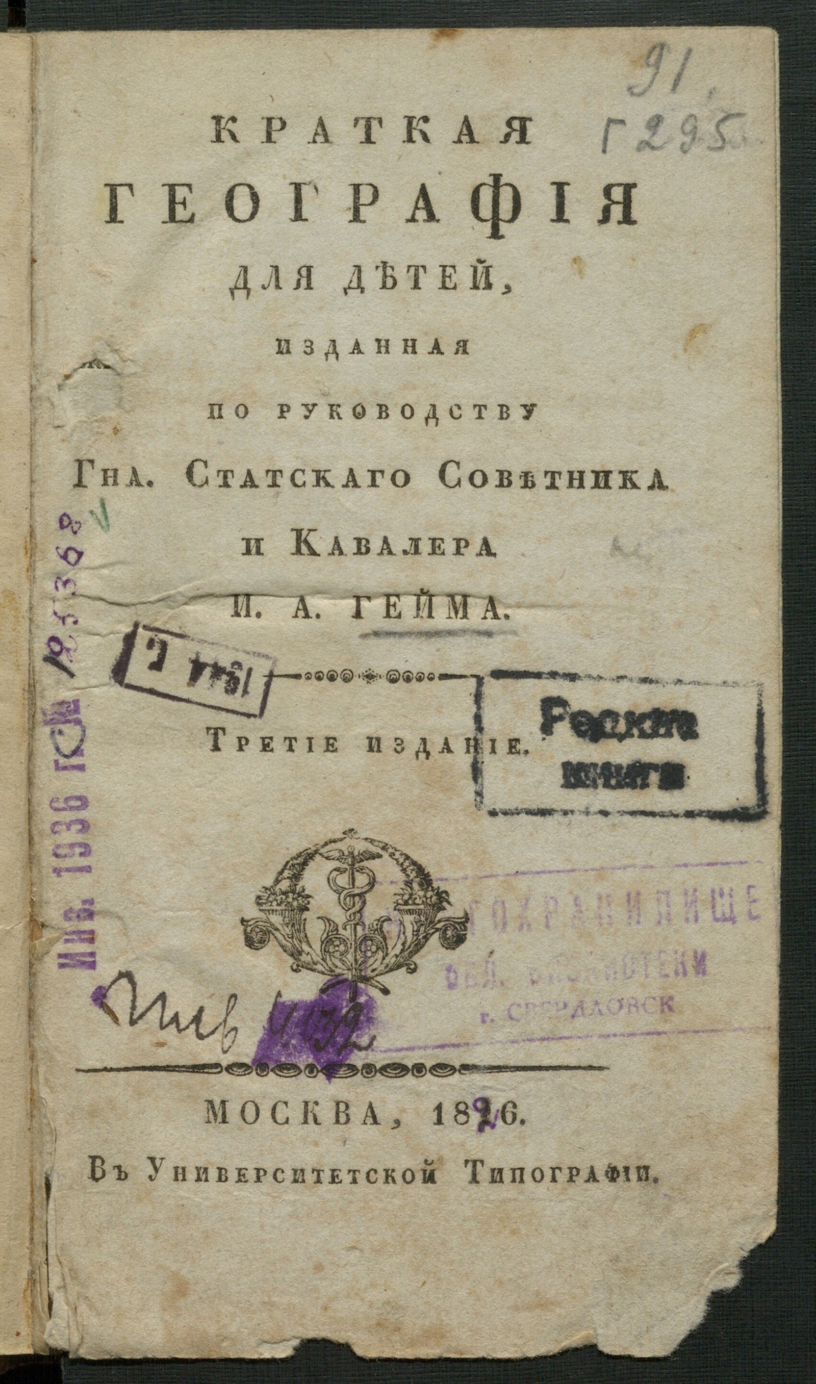 ИздательствоКраткая география для детей, / изданная по руководству г-на статскаго советника и кавалера И. А. Гейма. — Третие издание