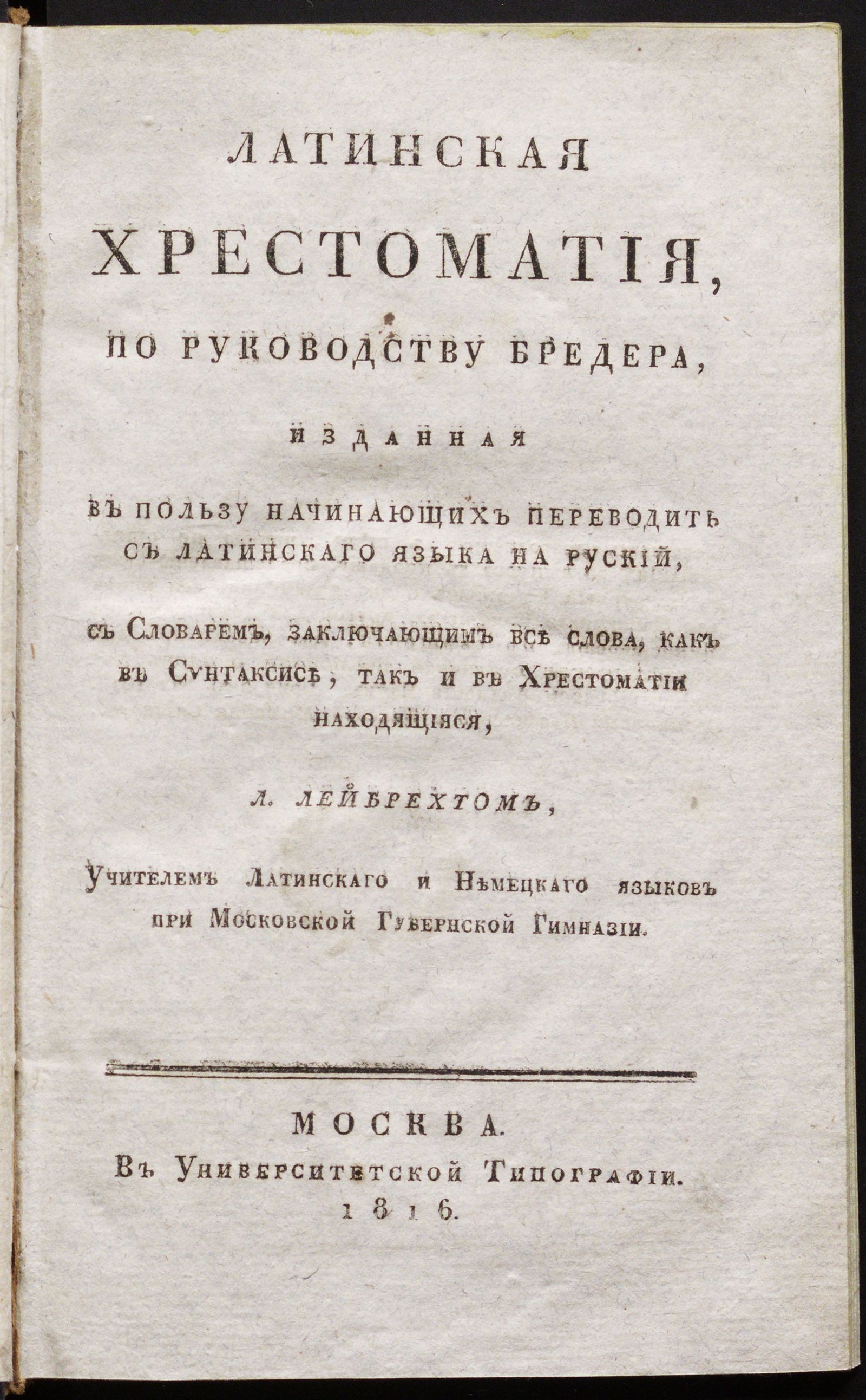 ИздательствоЛатинская хрестоматия, по руководству Бредера, / Изданная в пользу начинающих переводить с латинскаго языка на руский, с словарем, заключающим все слова, как в синтаксисе, так и в хрестоматии находящияся, Л. Лейбрехтом, учителем латинскаго и немецкаго языков при Московской губернской гимназии