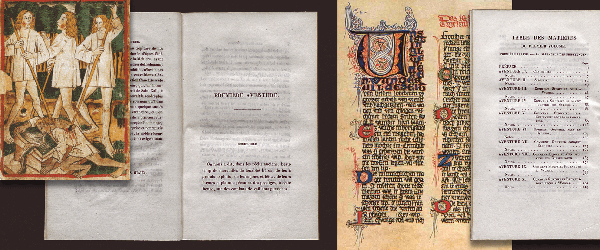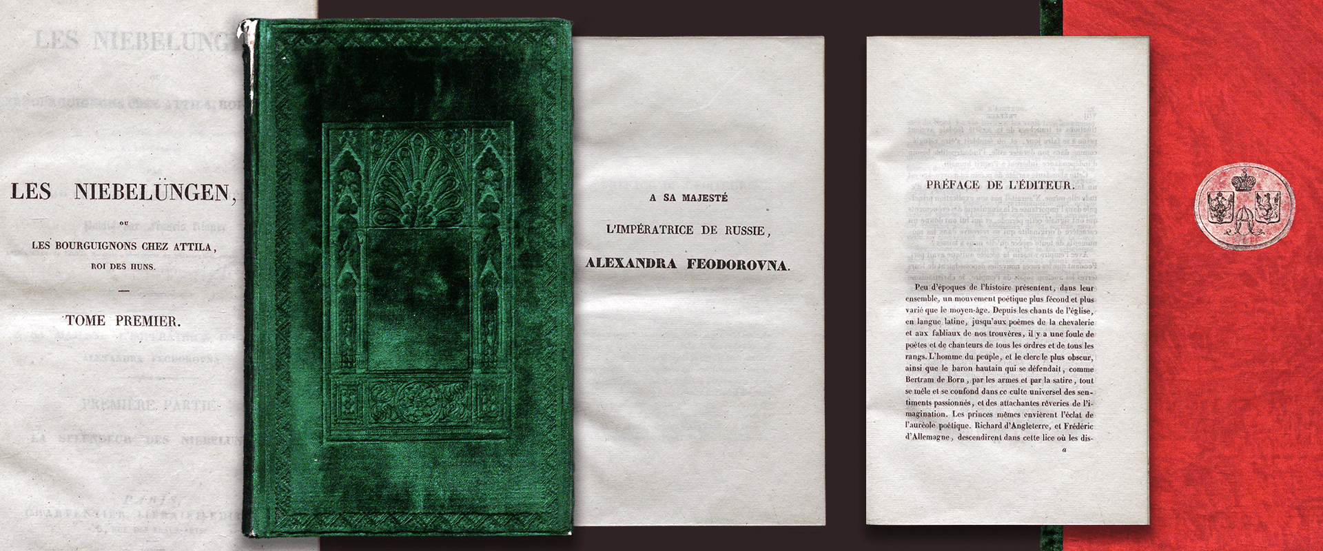 Литературный перевод «Песни о Нибелунгах» с немецкого на французский язык был выполнен Шарлоттой Моро де ла Мельтиер и посвящён императрице Александре Фёдоровне. Экземпляр происходит из коллекции императрицы и имеет её ярлык на форзаце.
