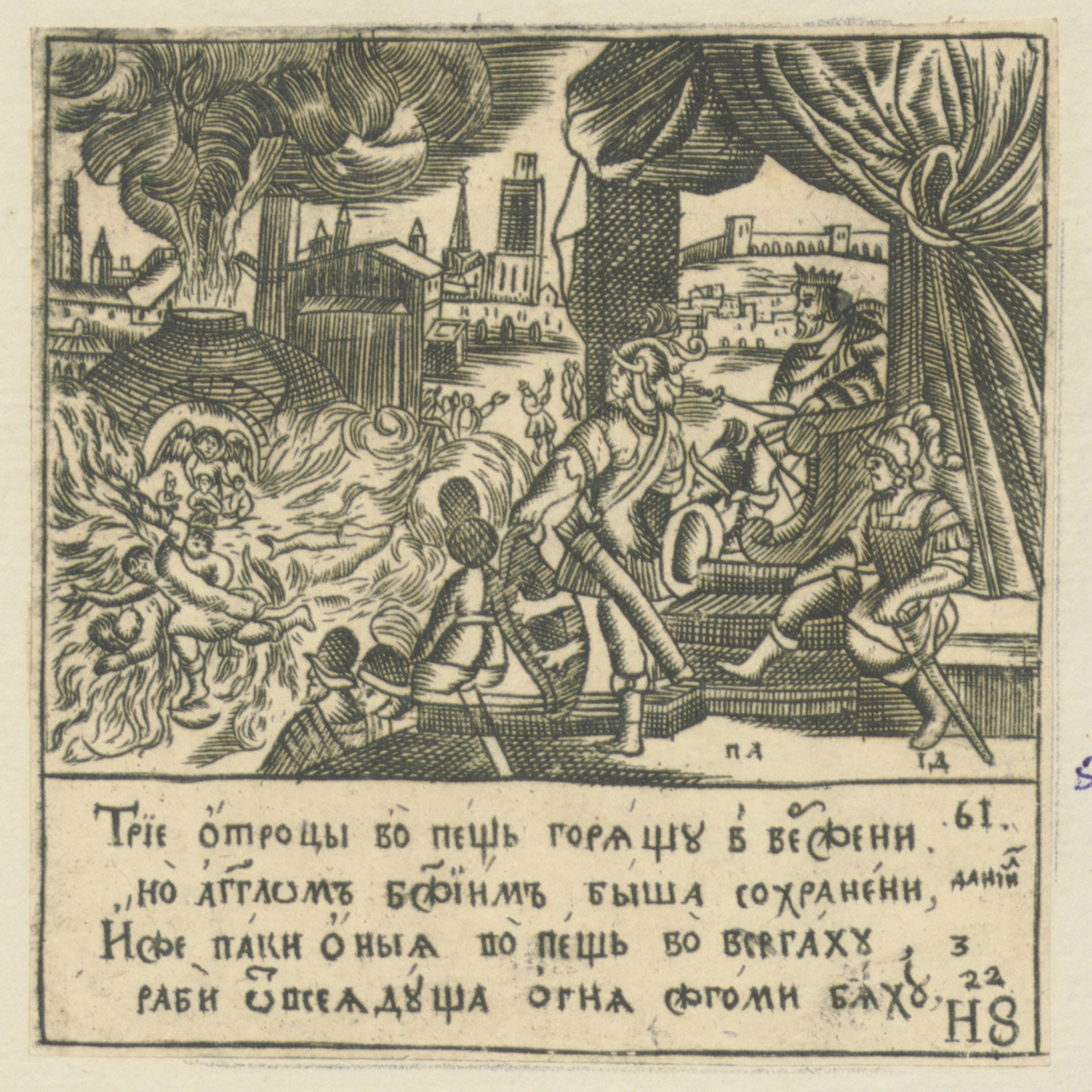 Место издания[Лицевая Библия]: Трие отроцы в пещь горящу ввержени… : [эстамп]
