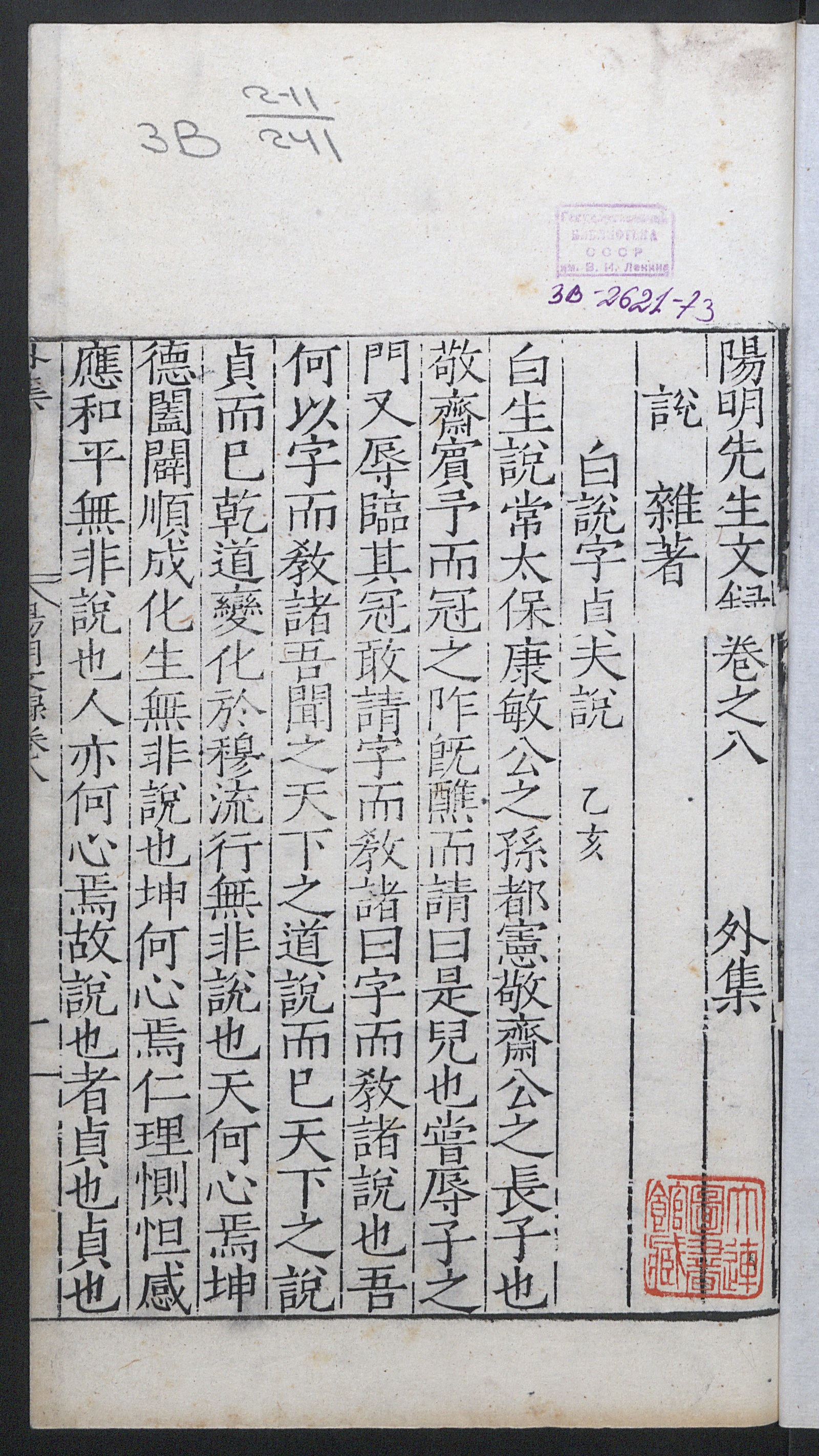 Издательство陽明先生文錄: [全二十四册] / [王陽明撰]. [Т. 7]. Литературные произведения Ван Янмина. Цзюань 1. 陽明先生文錄·外集·卷之一. [第七册]