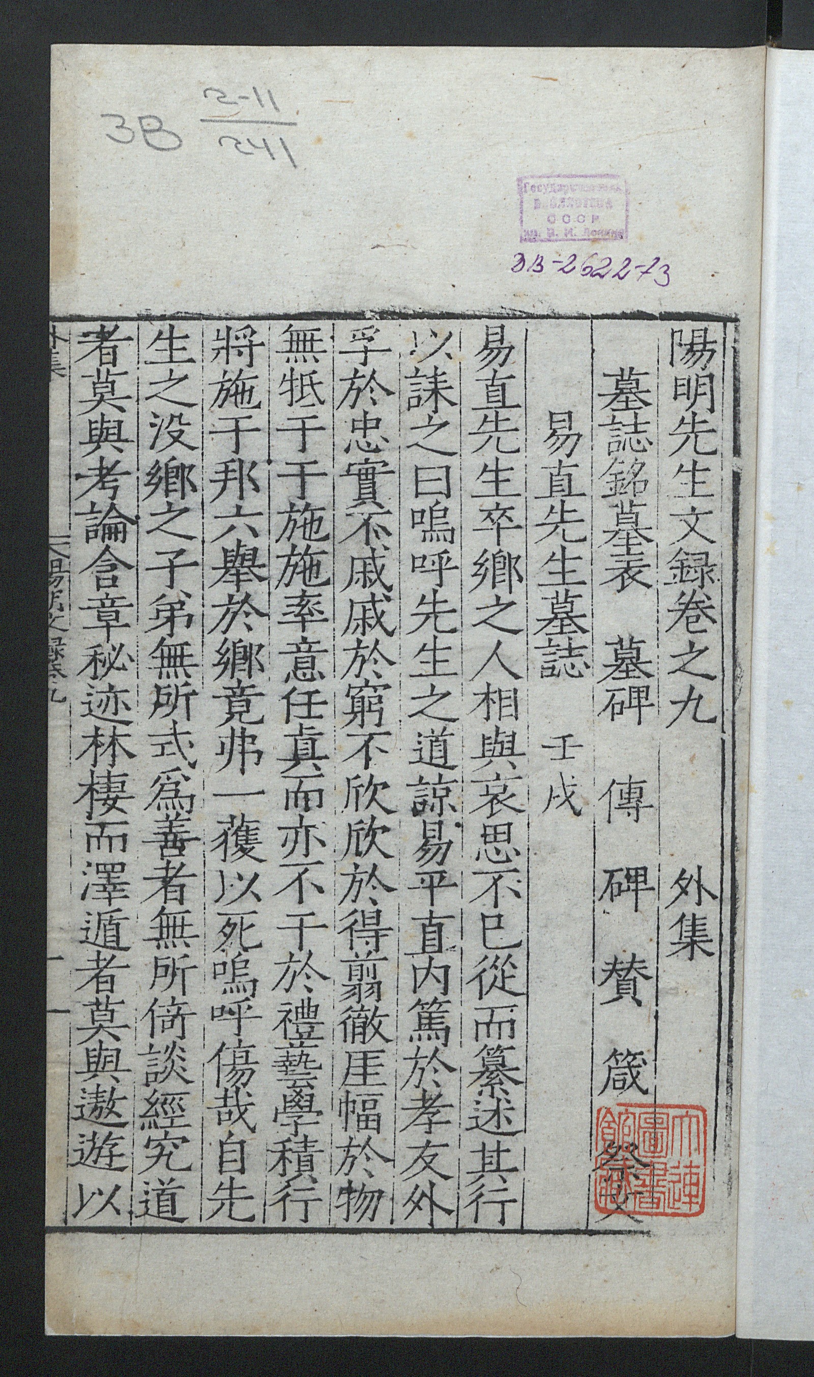 Ксилография. Без титульного листа. Общее заглавие взято с л. 1a первой фолиации т. 1. Дата указана в конце 2-го предисловия: 嘉靖丙申 [1536]. Оформление: рамка ок. 19,7×14,5 см, двойная по бокам, одинарная сверху и снизу, с разлиновкой строк. Десять строк на странице, 20 иероглифов в строке; иероглифы мелкого шрифта расположены попарно, 20 пар иероглифов в строке. На колонтитуле одна метка «рыбий хвост» (в виде незаполненного контура) и горизонтальная черта, сверху заглавие книги и номер цзюаня, снизу номер листа. Заглавие колонтитула различается: 陽明文錄 (т. 1-6, 11); 外集·陽明文錄 (т. 7-10, 12-14); 陽明别錄 (т. 15-24). Фолиация китайскими цифрами. Дефекты печати: на отдельных листах тушь смазана (преимущественно вдоль рамки); на л. 27-28 непропечатанные полосы (на печатных досках были трещины); на л. 31b часть текста была отпечатана дважды со смещением печатной доски. Прошивная брошюровка, подложка. Шитьё жёлтыми нитками через четыре отверстия. Защитный материал на уголках из светлого шёлка, снизу на нём написан номер тома. Защитные листы в начале и в конце книги. Синие бумажные обложки. На обложке каждого тома два технических ярлыка библиотеки Южно-Маньчжурской ж/д компании: 1) с номером тома; 2) с шифром 231/205 и печатью 貴重書 («драгоценная книга»). Сохранность: книга была реставрирована методами традиционной китайской реставрации в неустановленное время; листы укреплены по сгибу. Фоксинги на двух защитных листах в начале книги и на л. 1-2. Пятно на л. 14а (грязь). Утраты с повреждением текста на л. 4b, 16b, 26а, заплатки. Утрачен фрагмент подложки л. 16. Записи: на 2-м защитном листе и на л. 1a (карандаш). Книжные знаки: на 2-м защитном листе печати: 1) S. M. R. Library, внутри номер 558673 и дата 昭 4.12.7 (1929 г.); 2) 南滿洲鐵/道株式會/社圖書印 (оттиск от квадратной печатки с выпуклым текстом); 3) сверху штамп «погашено». Печать на л. 1а, 18a: 大連/圖書/館藏 (оттиск от квадратной печатки с выпуклым текстом). Печать на л. 1a: Государственная библиотека СССР им. В. И. Ленина, рядом указан рег. номер ЗВ-2333-74. На 1-м защитном листе печать отдела реставрации ГБЛ: 14. Футляр: книги хранятся в футлярах (по шесть томов в каждом) из картона, покрытого синей тканью. На каждом футляре: 1) наклейка из цветной бумаги без надписей; 2) ярлык библиотеки Южно-Маньчжурской ж/д компании с заглавием произведения 陽明文錄, номером футляра и заглавием раздела произведения; 3) с шифром 231/205 и печатью 貴重書 («драгоценная книга»); 4) два технических ярлыка РГБ с шифром и номерами томов.