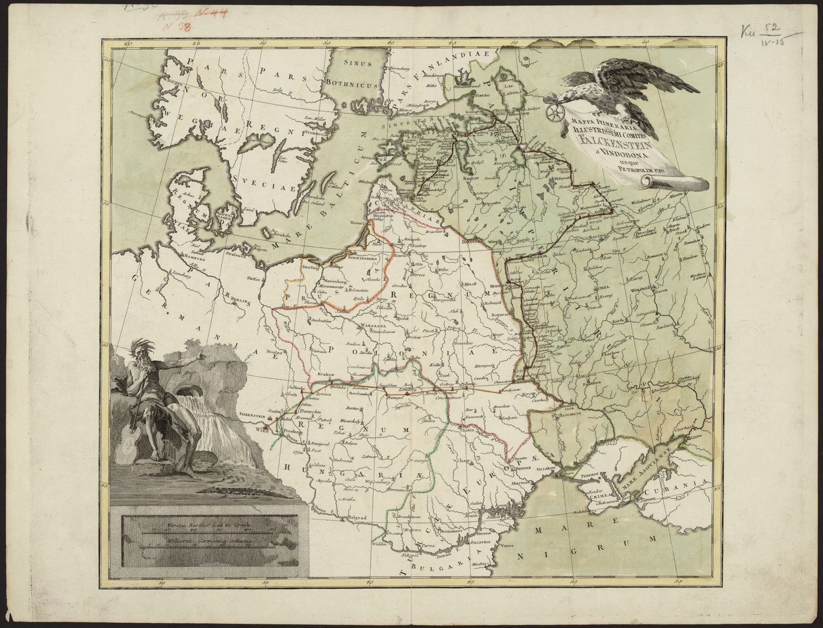 Гравированная карта маршрута графа Фалькенштейна (императора Иосифа II) из Вены в Петербург в 1780 г. Картографическая сетка. Долгота от Ферро. Масштабы в художественном картуше внизу слева. Заглавие в картуше. Бумага с филигранью. Сохранность хорошая, надрыв 11 см по линии сгиба снизу. Пометы на лицевой и обратной стороне листа (карандаш, чернила). Штемпель Российской государственной библиотеки на обратной стороне.