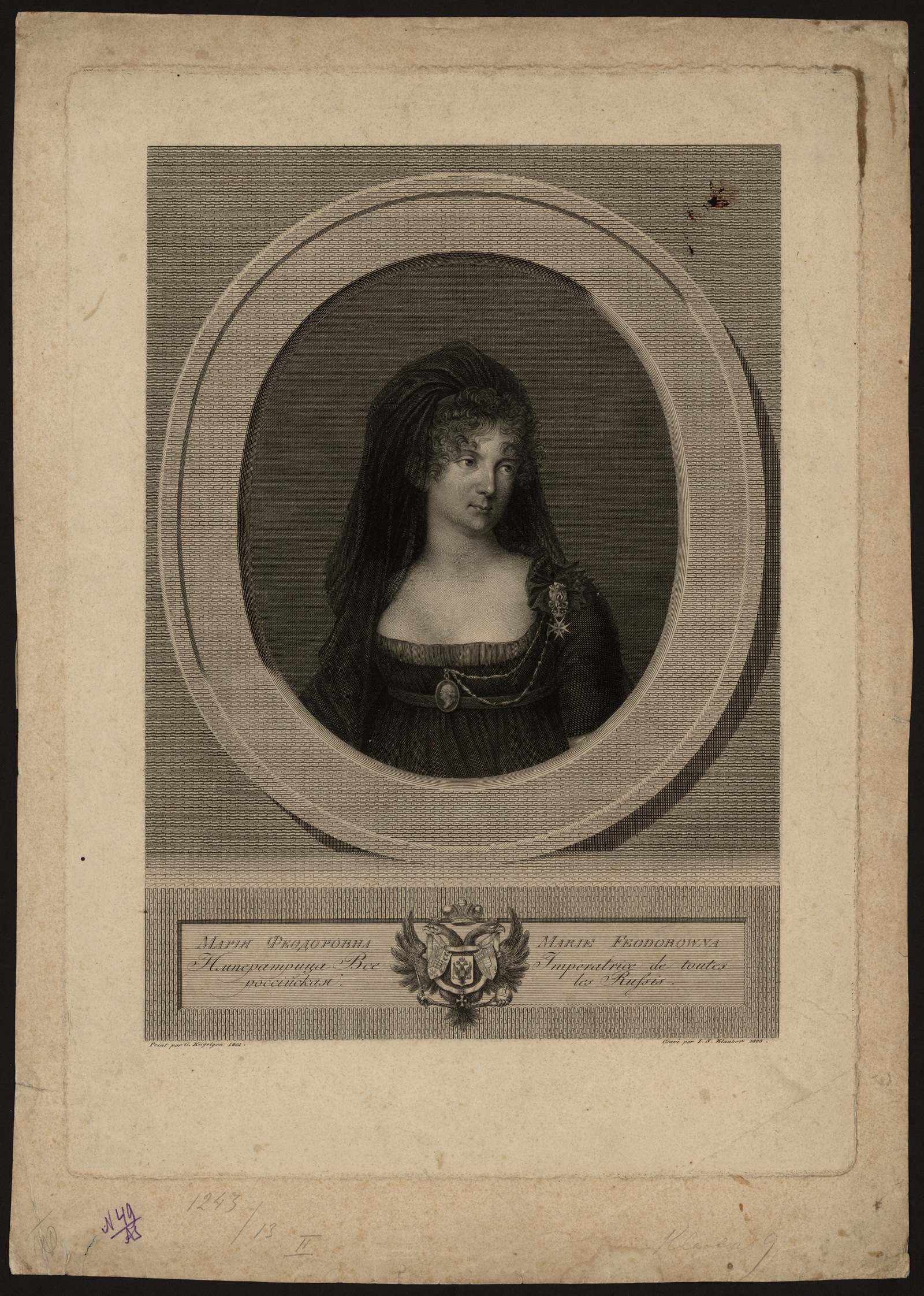 Место изданияМария Феодоровна императрица Всероссийская = Marie Feodorowna Imperatrice de toutes les Russis: [эстамп] / gravé par I. S. Klauber 1805; peint par G. Kügelgen 1801. — [Сост. без посвящ., не указано у Ровинского]