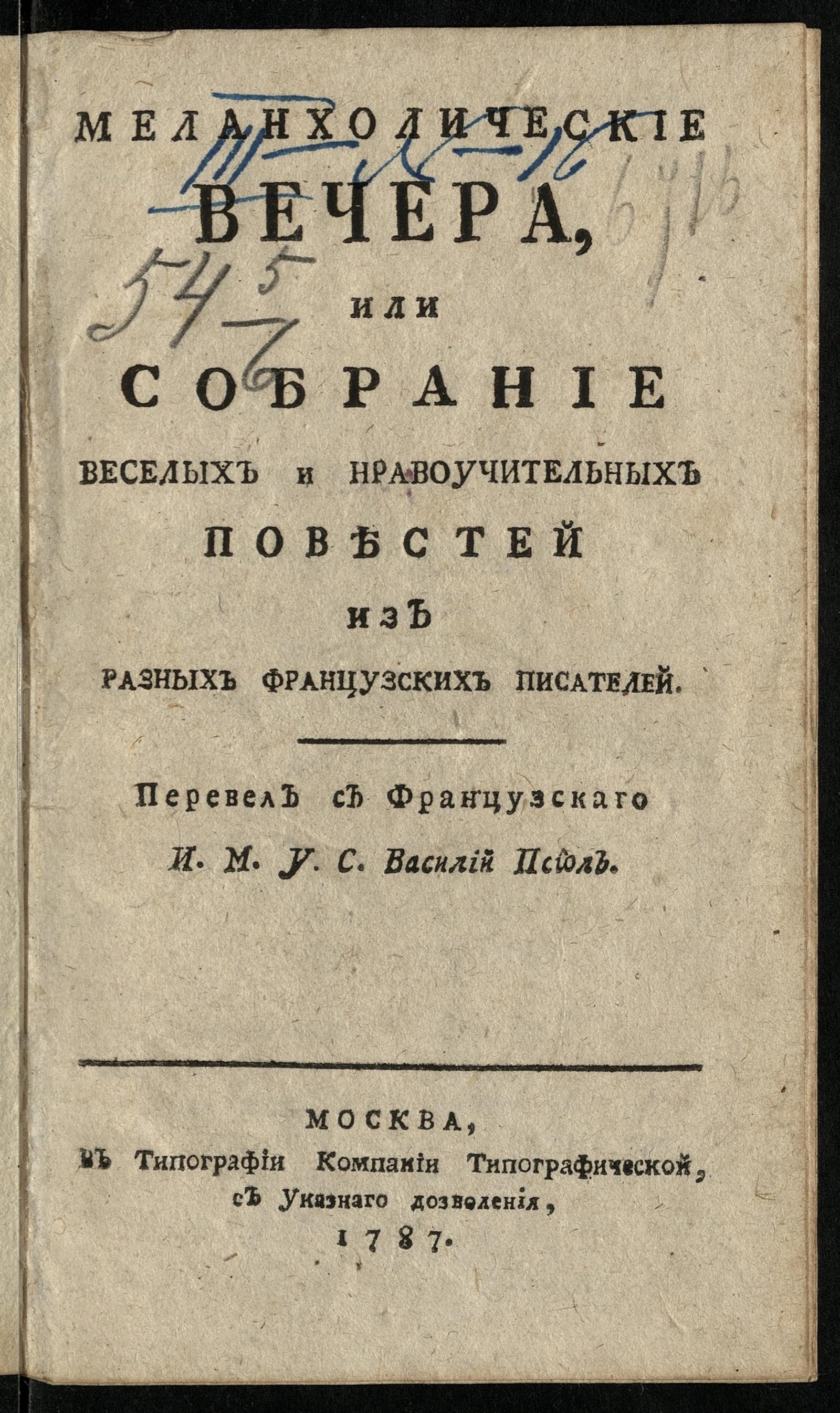 ИздательствоМеланхолические вечера, или Собрание веселых и нравоучительных повестей из разных французских писателей / Перевел с французскаго языка И[мп.] М[осковскаго] у[ниверситета] студент Василий Псиол
