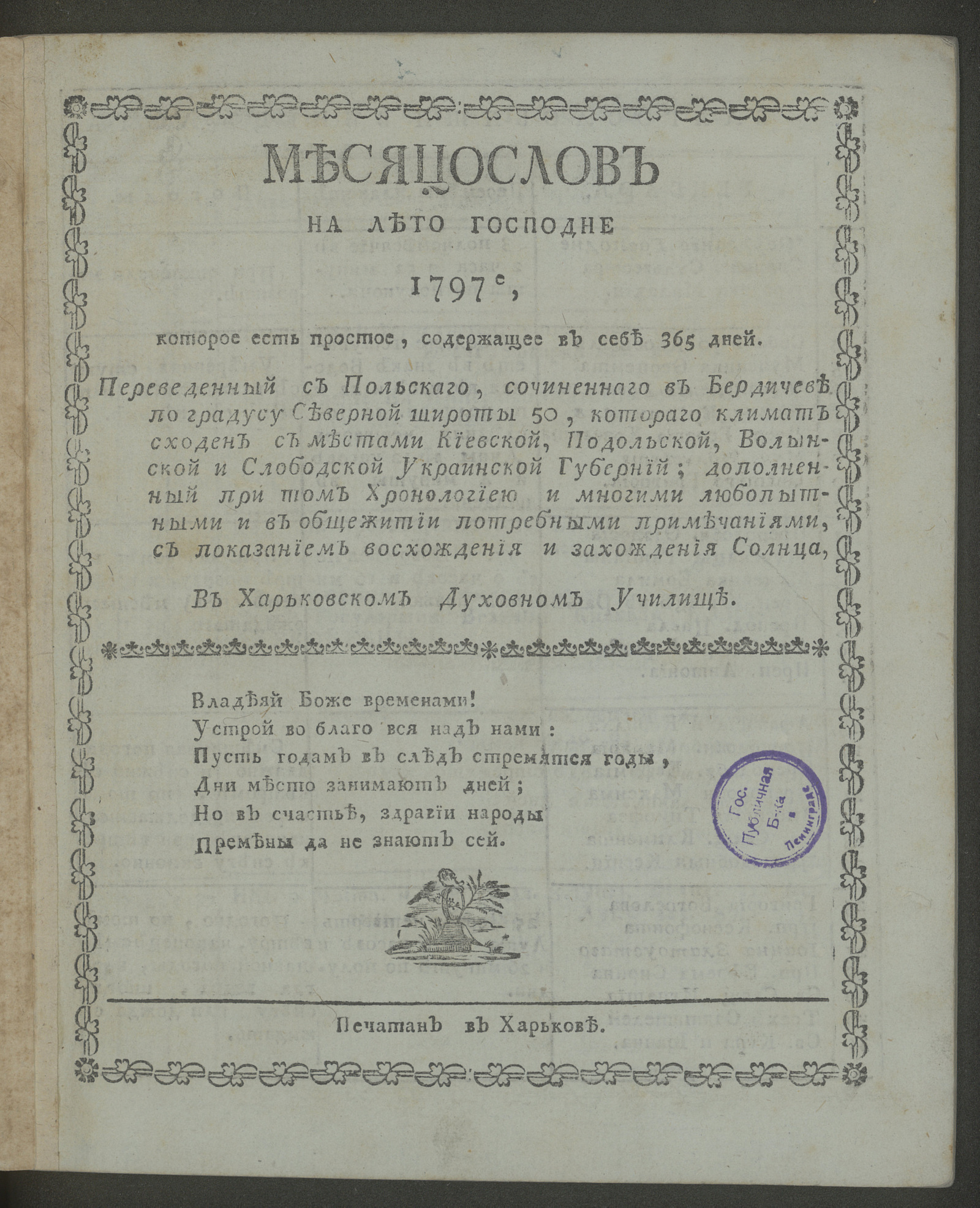 ИздательствоМесяцослов на лето господне 1797е, которое есть простое, содержащее в себе 365 дней