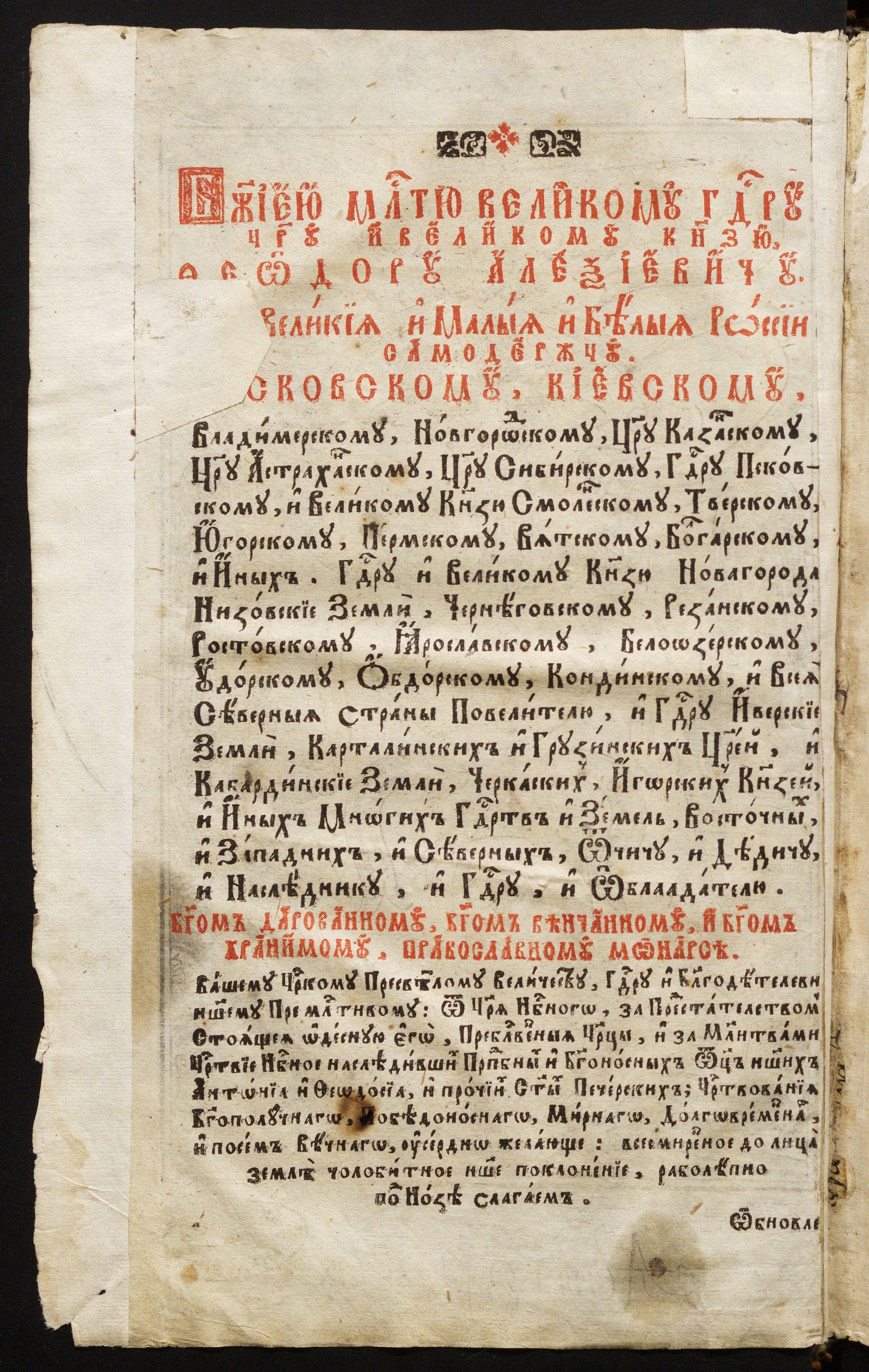 Вклеен 1 л. с рукописным текстом, полуустав XIX в. Сохранность: утраты двух застежек на переплете. Записи: 1) владельческая 1690 г. — на форзацном листе, скоропись. 2) об изготовлении переплета 1724 г. — на форзацном листе, скоропись. 3) вкладная 1684 г. — на л. [2]-54. Библиотечные пометы — на форзацных листах, титульном листе. Книжные знаки: штемпели: библиотеки Московской духовной академии (на тит. л. об., л. [2]), библиотеки Московской духовной академии (на л. [1] об., [2]), Российской государственной библиотеки (на л. 509 об.); ярлык «Дублеты б-ки Москов. Син. Типогр. № 307» (на форзаце); технические ярлыки на корешке (2). Переплет: доски, кожа, блинтовое тиснение; обрез золотой с тиснением.