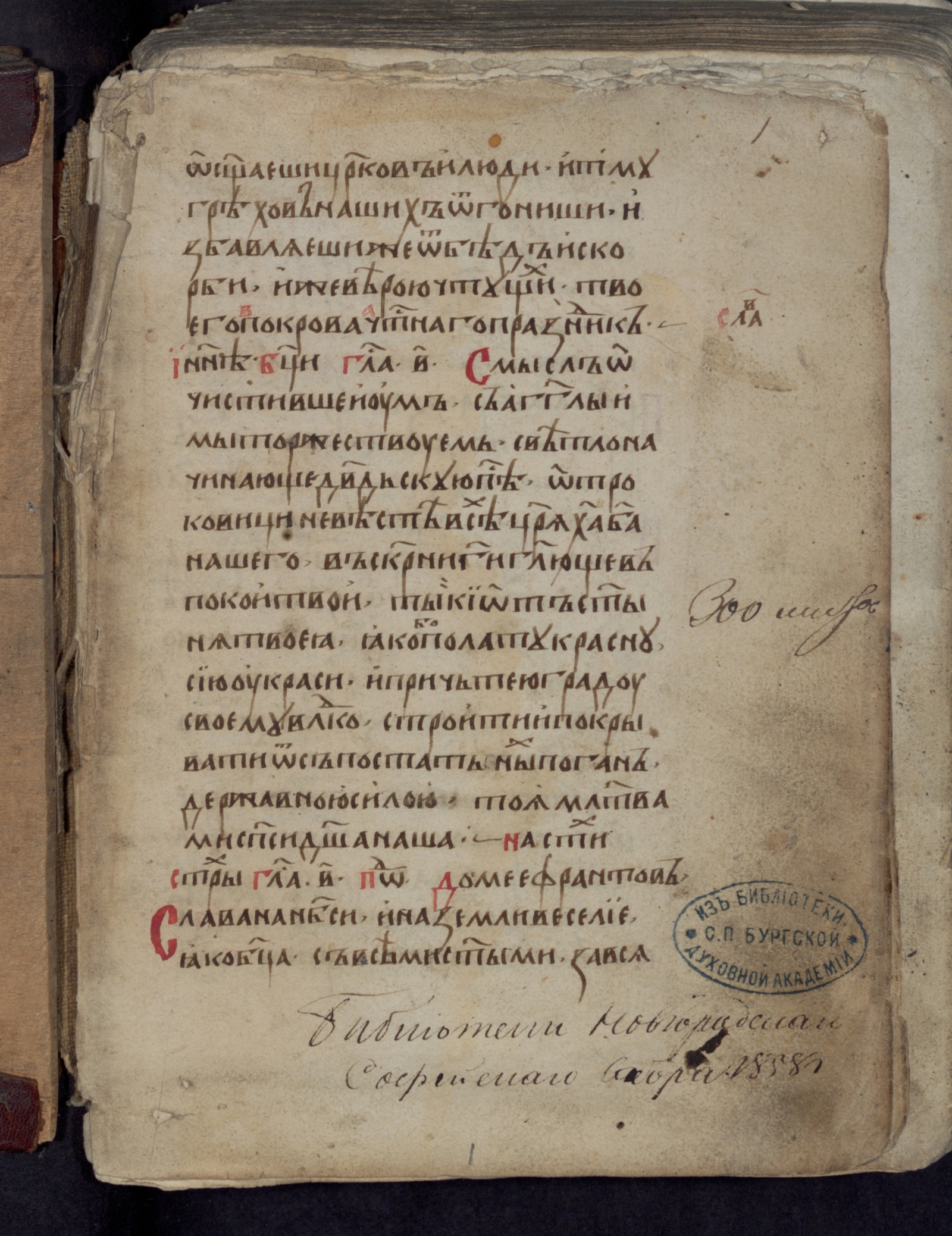Тип письма: Полуустав одной руки. Писец / переписчик: Мартирий (писец; XV в.) (?). Фрагментарность: Без начала. Переплет: Доски в коже с тиснением. Записи, надписи: На л. 112 рукой писца — «Увы мне, комары съдоливают ми! Горе тебе, Мартирье, не стяжавшему терпениа». Ф. 728 — Библиотека Новгородского Софийского собора.