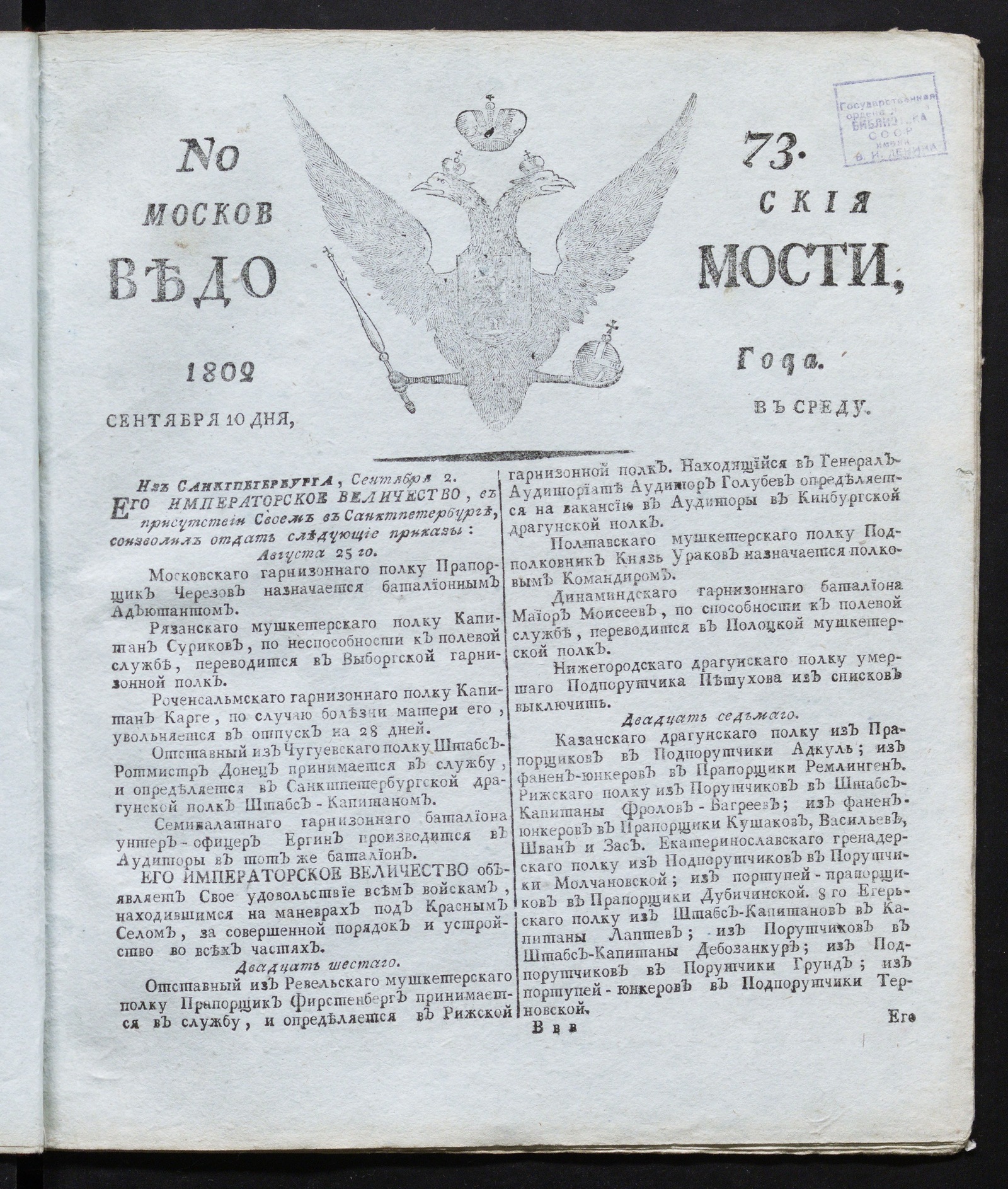 ИздательствоМосковския ведомости: газета. — 1802, № 73 (10 сентября)