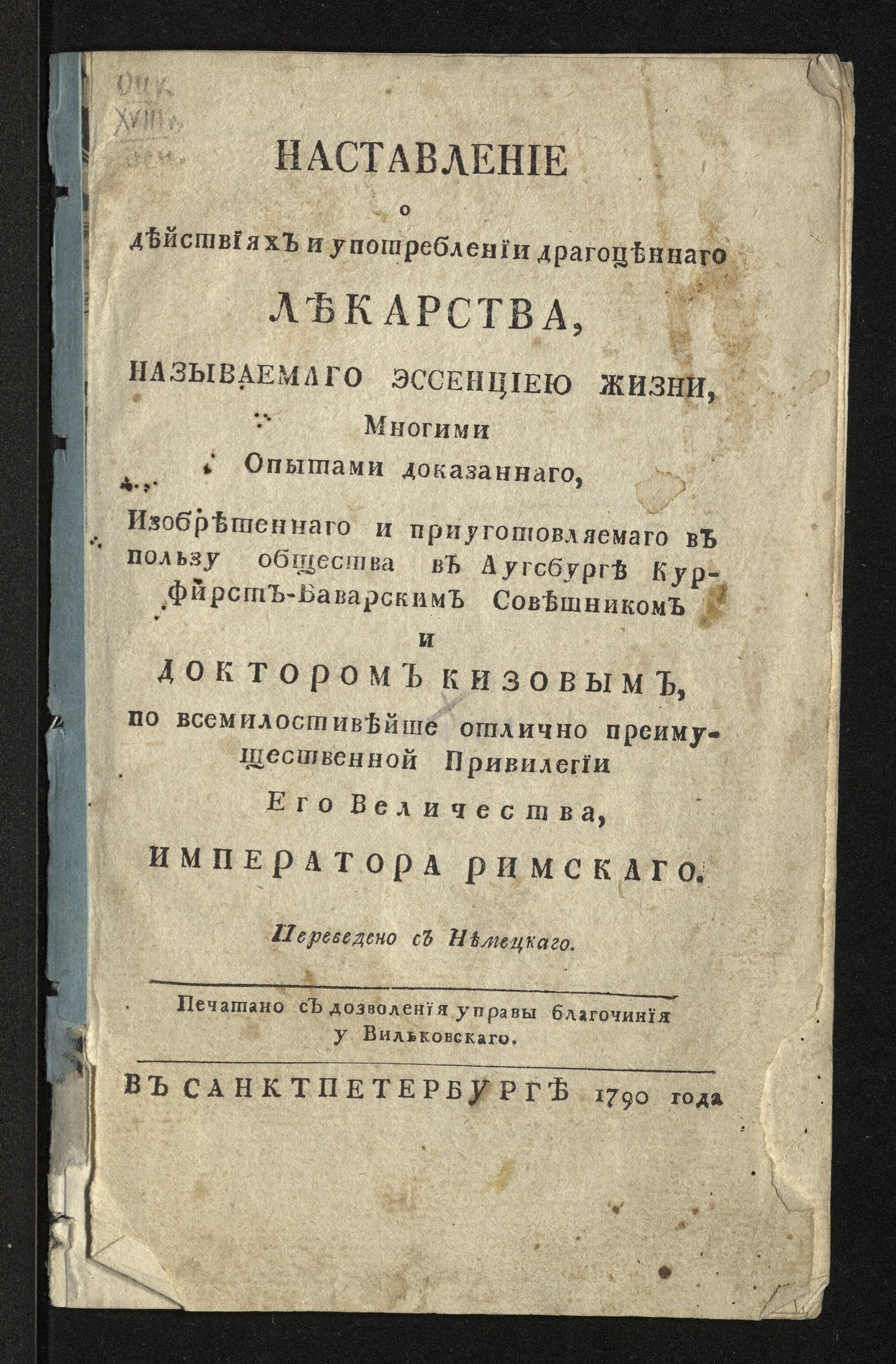 ИздательствоНаставление о действиях и употреблении драгоценнаго лекарства, называемаго эссенциею жизни, многими опытами доказаннаго, / Изобретеннаго и приуготовляемаго в пользу общества в Аугсбурге курфирст-баварским советником и доктором Кизовым, по всемилостивейше отлично преимущественной привилегии его величества, императора Римскаго. ; Переведено с немецкаго [Данилой Гродницким]
