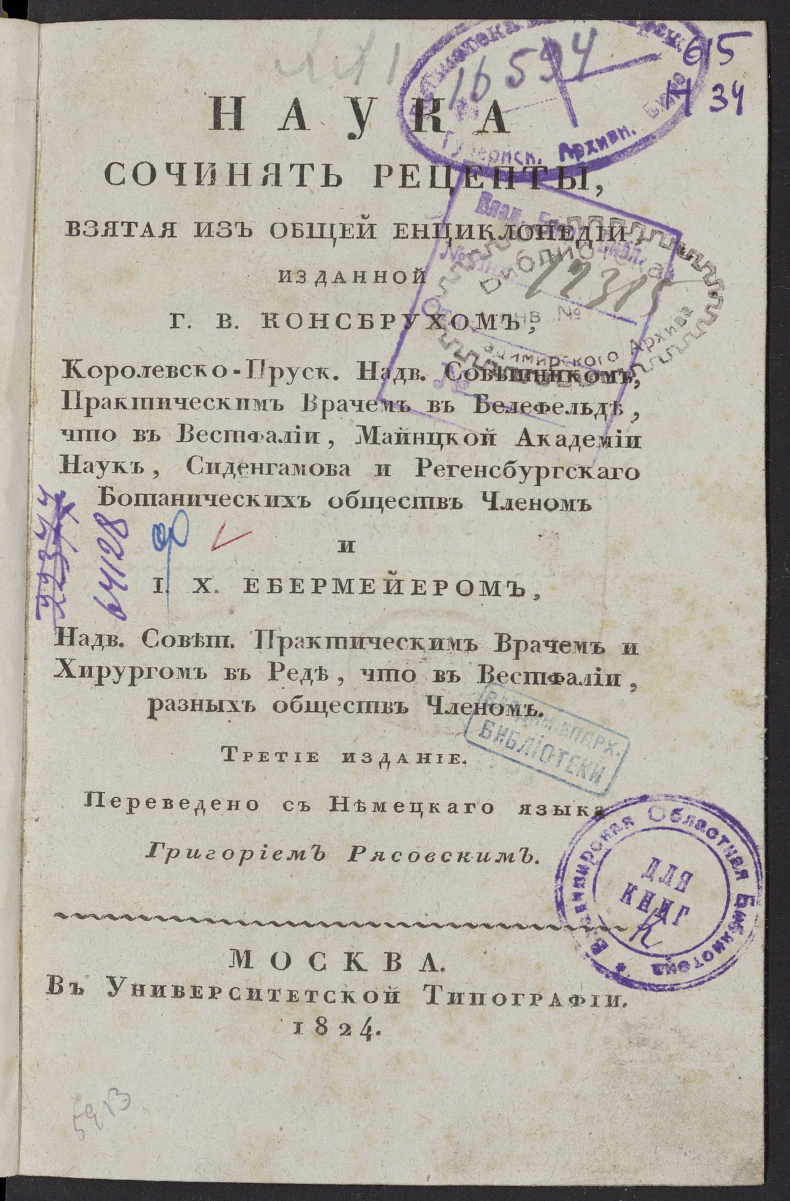 ИздательствоНаука сочинять рецепты: взятая из общей енциклопедии / изданной Г. В. Консбрухом, королевско-пруск. надв. советником, практическим врачем в Белефельде, что в Вестфалии, Майнцкой академии наук, Сиденгамова и Регенсбургскаго ботанических обществ членом и И. Х. Ебермейером, надв. совет., практическим врачем и хирургом в Реде, что в Вестфалии, разных обществ членом.; переведено с немецкаго языка Григорием Рясовским. — Третие издание