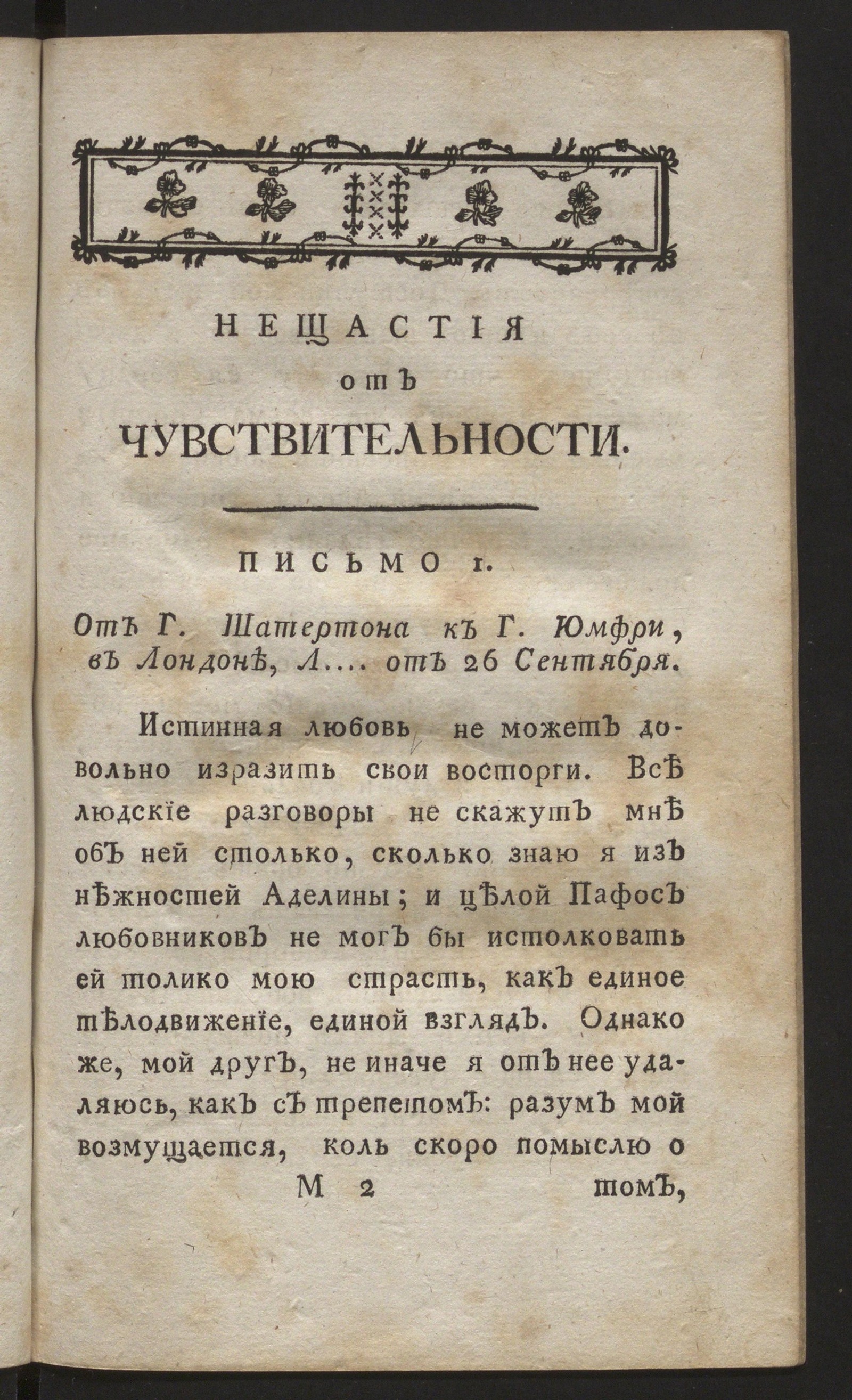 ИздательствоНещастия от чувствительности / Сочинение Г. Фильдинга, [!]; С третьяго издания на англинском языке преложенное на французской гм. Мерсие, ; А с онаго на российской язык перевел Н**** Н****; Ч. 1 и 2, содержащия в себе 58 писем. Ч. 1