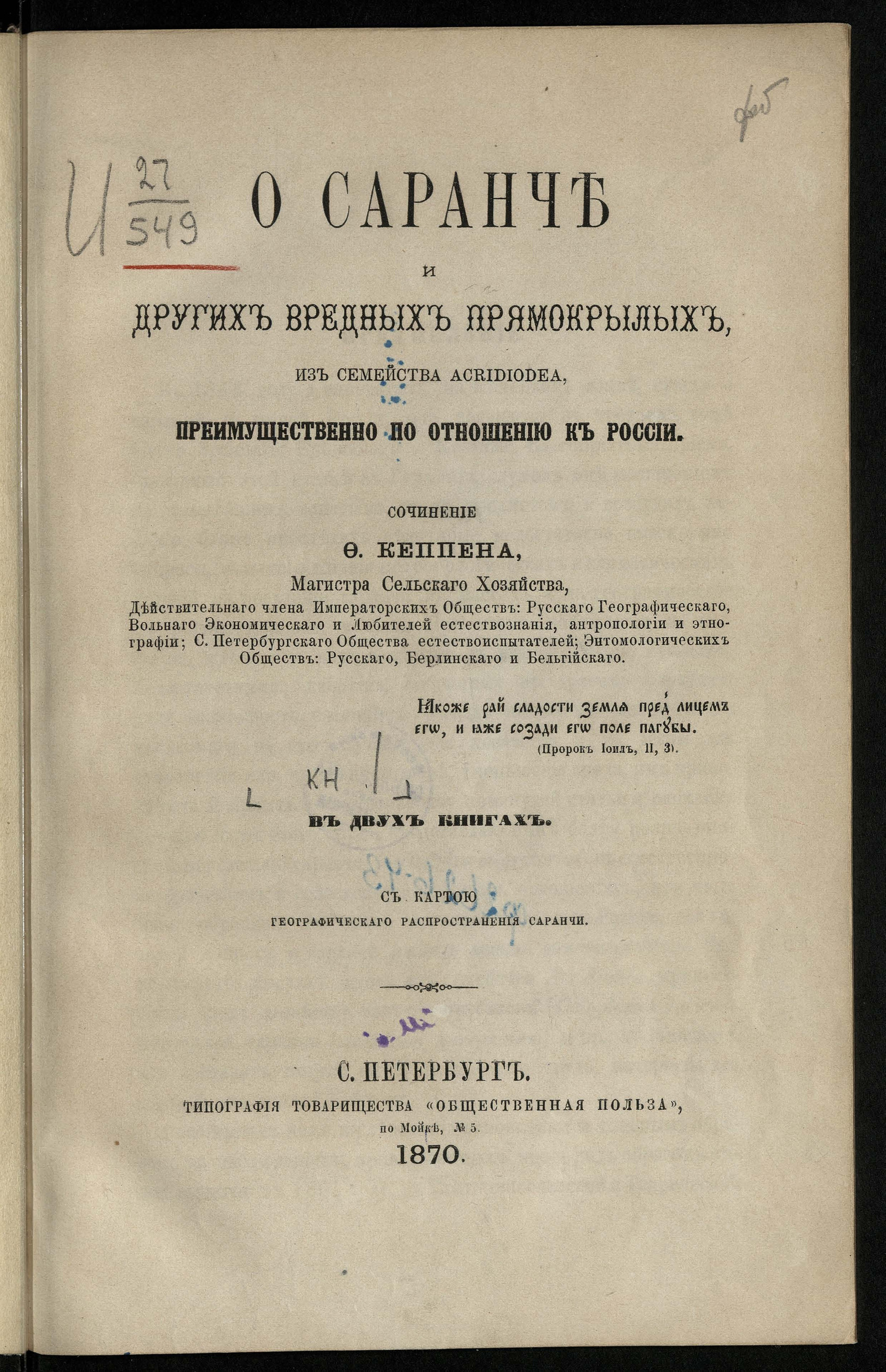 В двух книгах. С картою географическаго распространения саранчи. (Книга 1)
