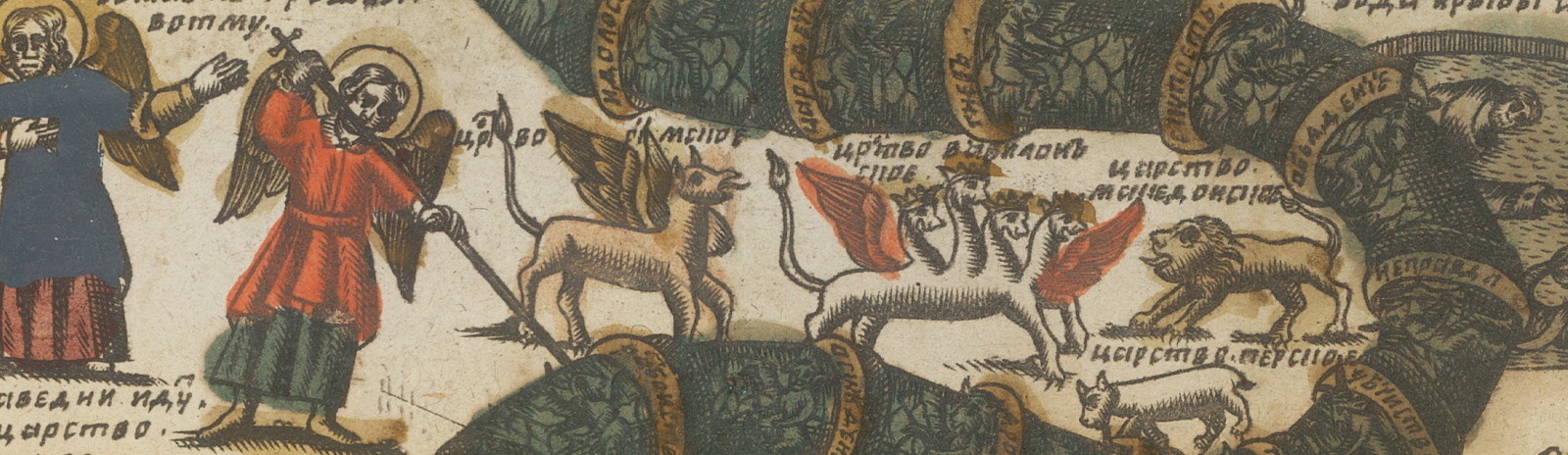 Народная картинка «Образ Страшнаго суда Божия», датируемая XVIII веком, следует русской православной традиции. Иконография Страшного суда складывается к XV веку. Для иконописцев составляются так называемые подлинники — своего рода инструкции по написанию образов: «С краю горний Иерусалим, а в нем церкви и полаты, а во дверях ангелы и шесть ликов… От города облак силы, а в облаке Отец на престоле…» и т. д. Это строки из Клинцовского иконописного подлинника — рукописи XVIII века, с которой рассматриваемый лист из собрания М. П. Погодина обнаруживает известное сходство: по левому краю композиции в Горний Иерусалим возносятся крылатые схимники, по правому краю (от Христа по левую руку) бесы низвергаются в ад. Господь Саваоф в окружении херувимов взирает сверху на действо Страшного суда, ибо «весь суд отдал Сыну» (Ин. 5:22). Христос в мандорле (ореоле сияния, исходящего от фигуры), грозный и беспристрастный Судия, творит Суд в центральном поле изображения.