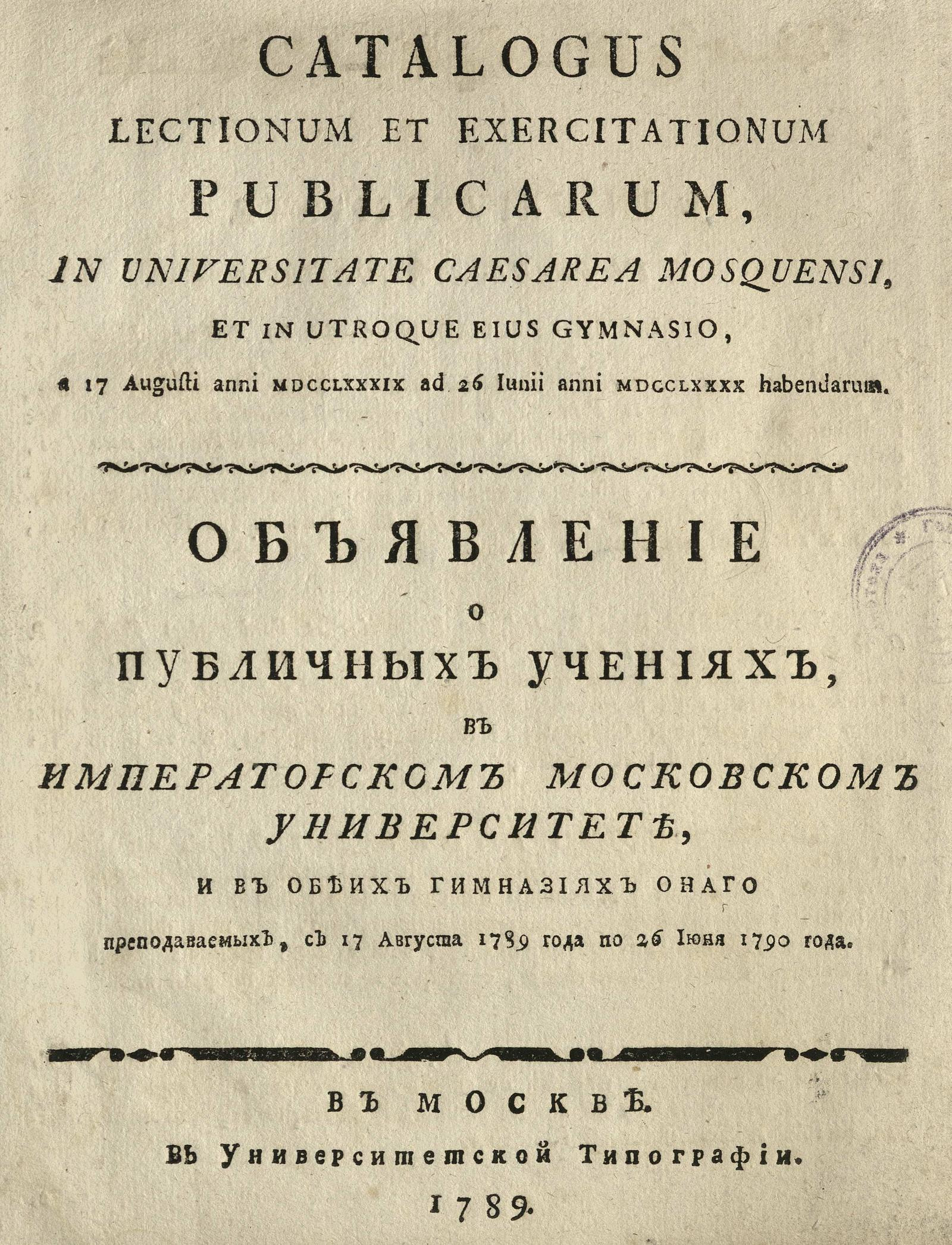 ИздательствоCatalogus lectionum et exercitationum publicarum, in Universitate caesarea mosquensi, et in utroque eius gymnasio, 17 augusti anni MDCCLXXXIX ad 26 iunii anni MDCCLXXXX habendarum. = Объявление о публичных учениях, в Императорском Московском университете, и в обеих гимназиях онаго преподаваемых, с 17 августа 1789 года по 26 июня 1790 года