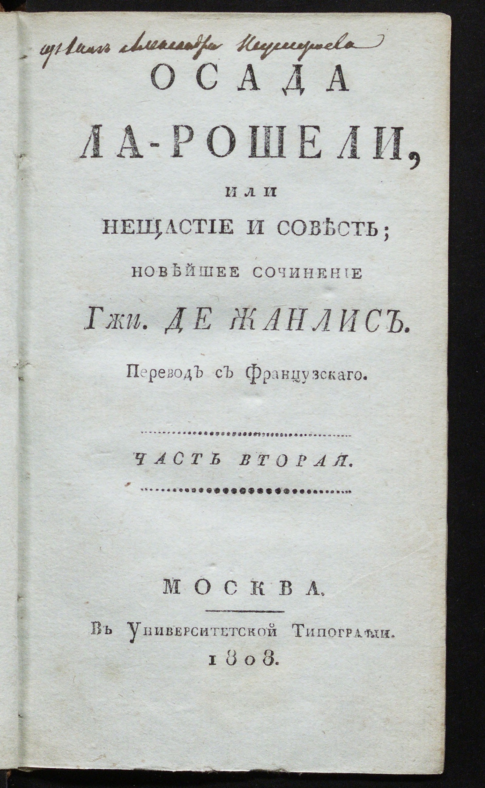 ИздательствоОсада Ла-Рошели, или Нещастие и совесть; / Новейшее сочинение гжи. де Жанлис.; Перевод с французскаго. Ч. 2