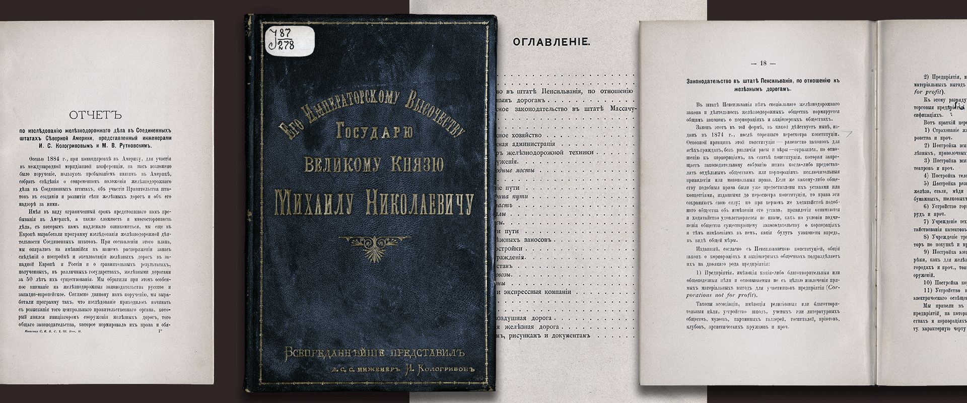 В России начался «железнодорожный бум». В голове у всех была невероятная мечта — сооружение магистрали через Урал, всю Сибирь вплоть до Владивостока. Это требовало знакомства с новейшими техническими решениями. В Америку неоднократно отправлялись делегации специалистов, привозившие технические и экономические материалы, необходимые для планирования работ в России. К числу таких материалов относится доклад русских инженеров-путейцев Ивана Семеновича Кологривова (1835-1908), члена Совета министра путей сообщения и Мечислава Владиславовича Рутковского (1853–?), специалиста по железнодорожному делу Франции. Доклад был опубликован в Типо-литографии С. Муллера и И. Богельмана и представлен в Государственный совет, председателем которого был Великий князь Михаил Николаевич (1832-1909).
