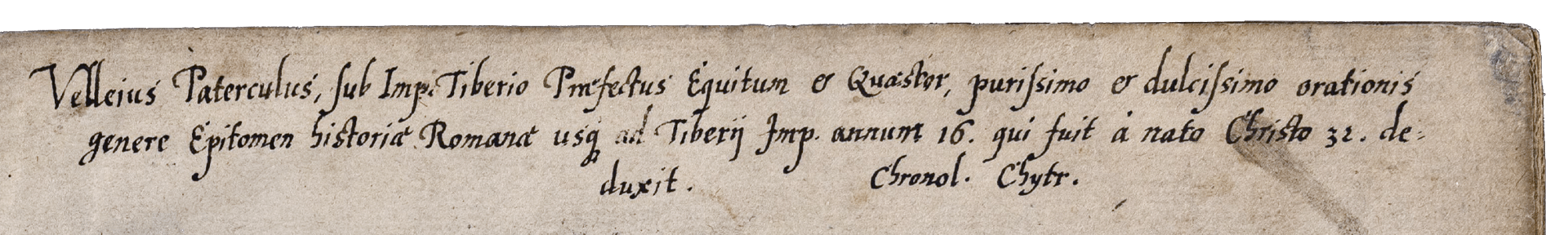Двухтомный исторический труд Марка Веллея Патеркула (ок. 19 до н. э. — ок. 31 н. э.), римского сенатора и военного, излагает всеобщую историю от Троянской войны до правления императора Тиберия. В нём автор впервые в истории античной историографии наряду с политической историей даёт также краткие очерки истории литературной как важные для понимания того или иного периода.
