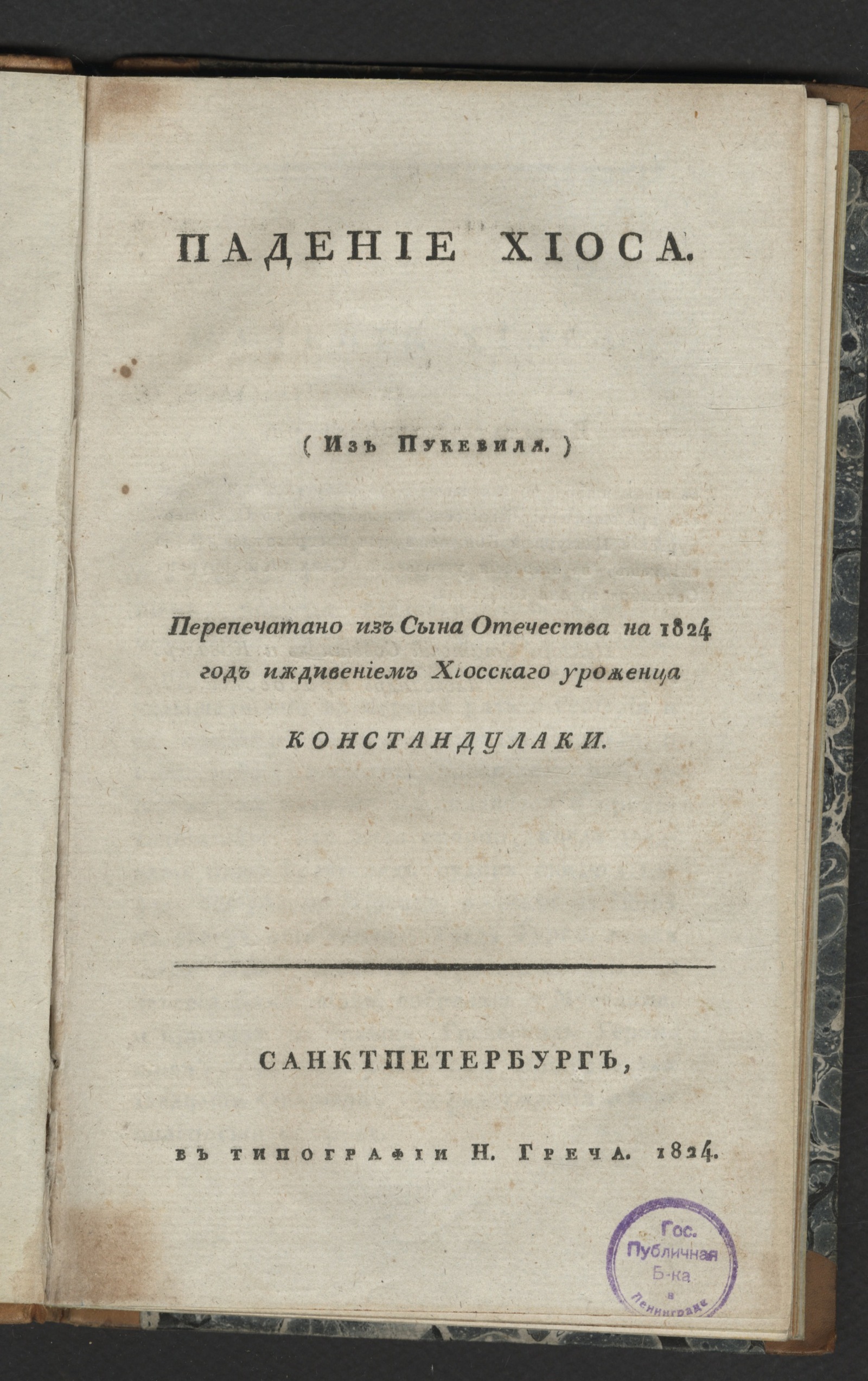 ИздательствоПадение Хиоса. : (Из Пукевиля.) Перепечатано из Сына отечества на 1824 год иждивением Хиосского уроженца Констандулаки