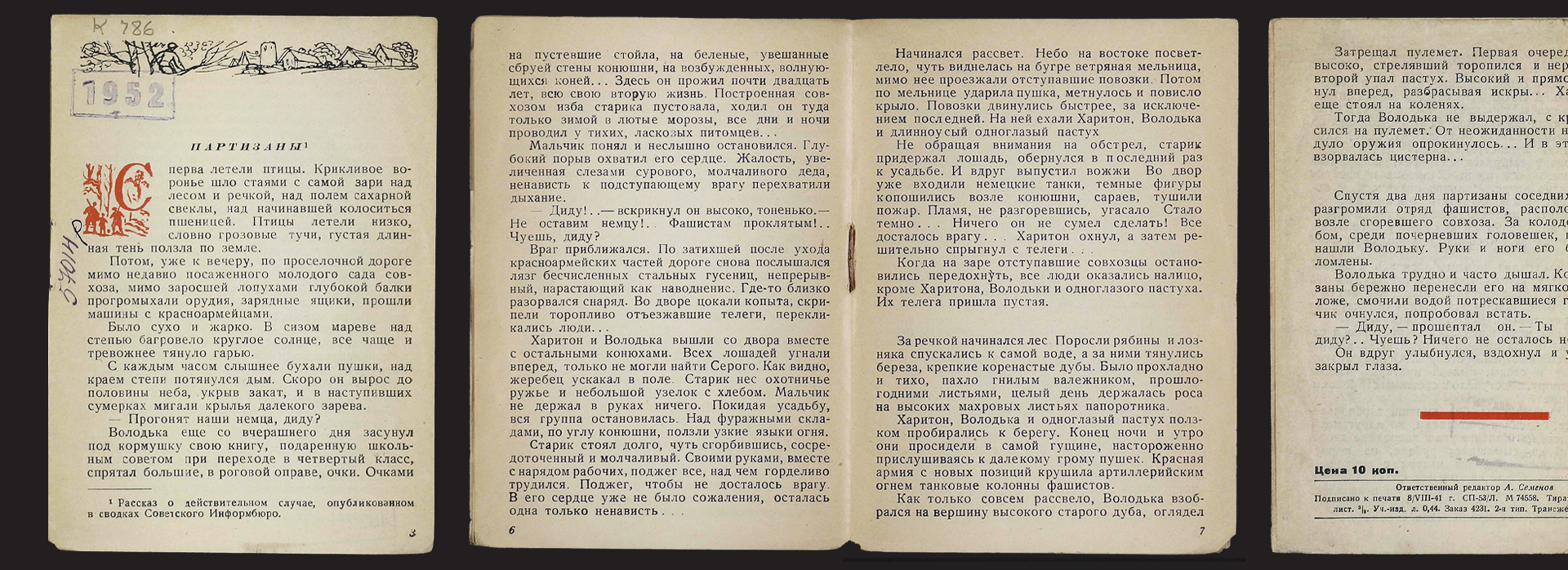 «Партизаны» — первая военная книжка писателя Ивана Федоровича Кратта, подписанная к печати 8 августа 1941 года — через месяц после начала войны — в ленинградском отделении издательства «Советский писатель». Совсем скоро, спустя тридцать дней, 8 сентября 1941 года, Ленинград будет окружен кольцом блокады, которая продлится 872 дня.