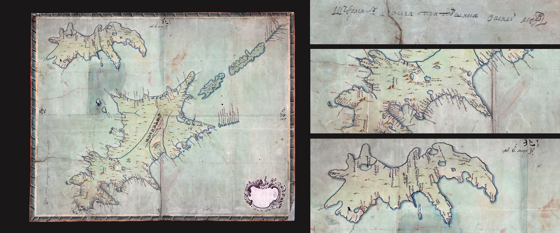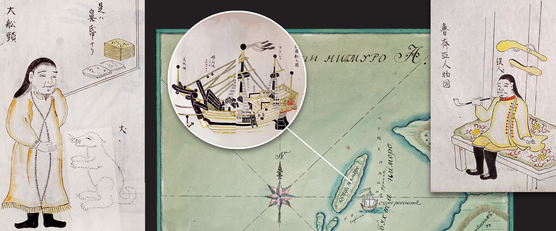 Помимо фрагмента карты, в изображении представлены фрагменты иллюстраций из рукописи «Оросиякоку суймудан» («Сны о России») ОР РГБ Ф. 184/II № 11 (1,2).