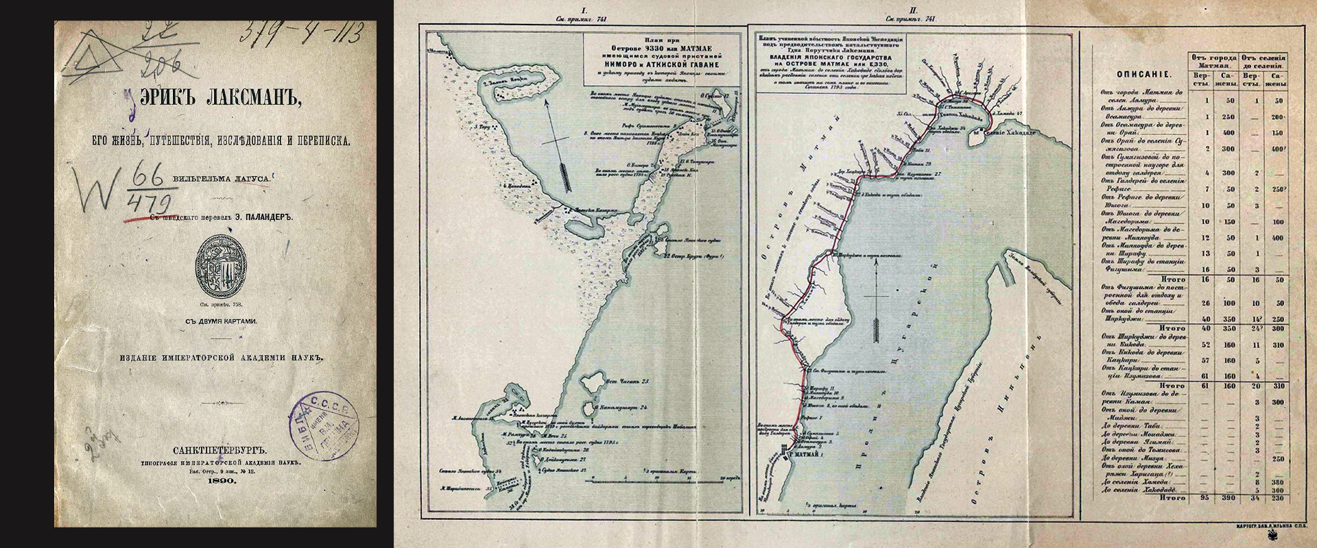 В монографии приводился список утерянных карт: 1 — Залив Немуро; 2 — Мыс Майомушири; 3 — Гавань Аткиси; 4 — Местность от Хакодате до Мацумая; 5 — Вид с залива между 18-м и 19-м Курильскими островами; 6 — Подлинная карта Японии. Названия первых пяти карт совпадают с перечнем карт, хранящихся в РГБ, сопоставима и литерная разметка. В судовом журнале Лаксмана дана полная характеристика местности, условия и дата составления каждого из планов, что позволило уточнить место и год составления карт — Хоккайдо, 1793.