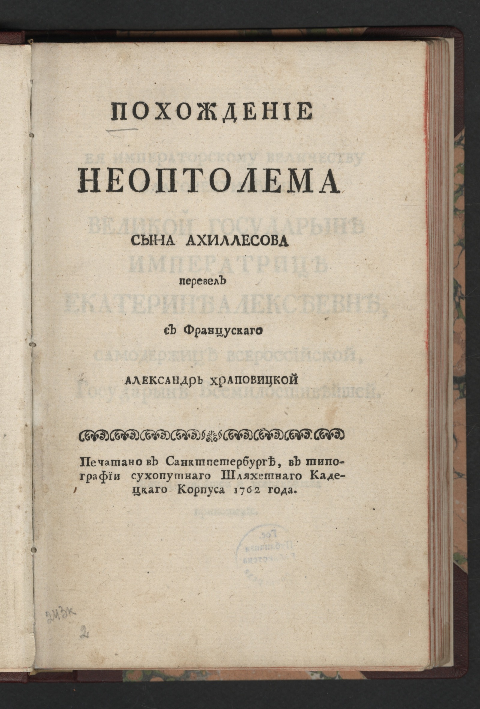 ИздательствоПохождение Неоптолема сына Ахиллесова / перевел с французскаго Александр Храповицкой