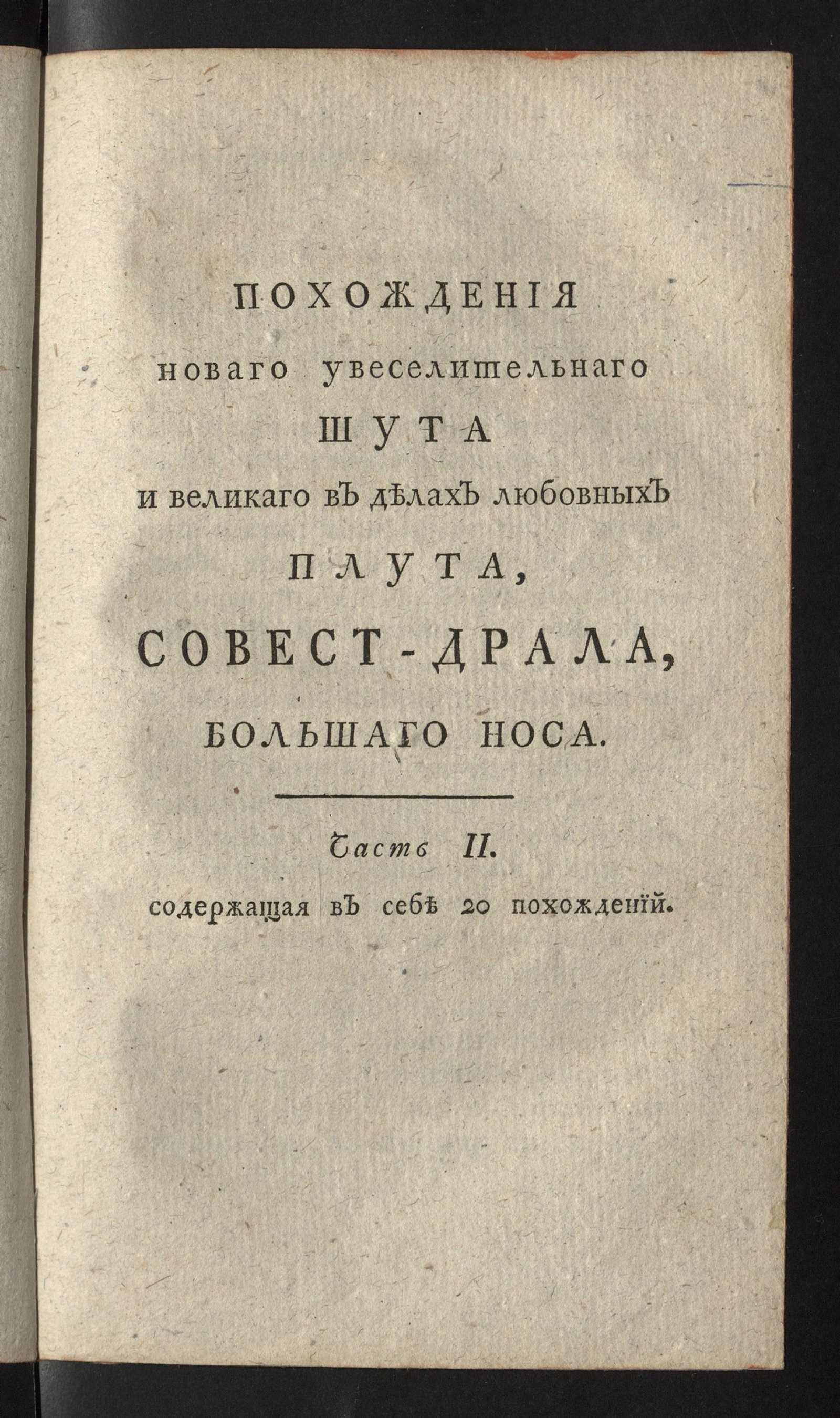 ИздательствоПохождения нового увеселительного шута и великого в делах любовных плута, Совест-Драла, Большого Носа: переведена с польского и дополнена с других языков. Ч. 2. Ч.2, содержащая в себе 20 похождений