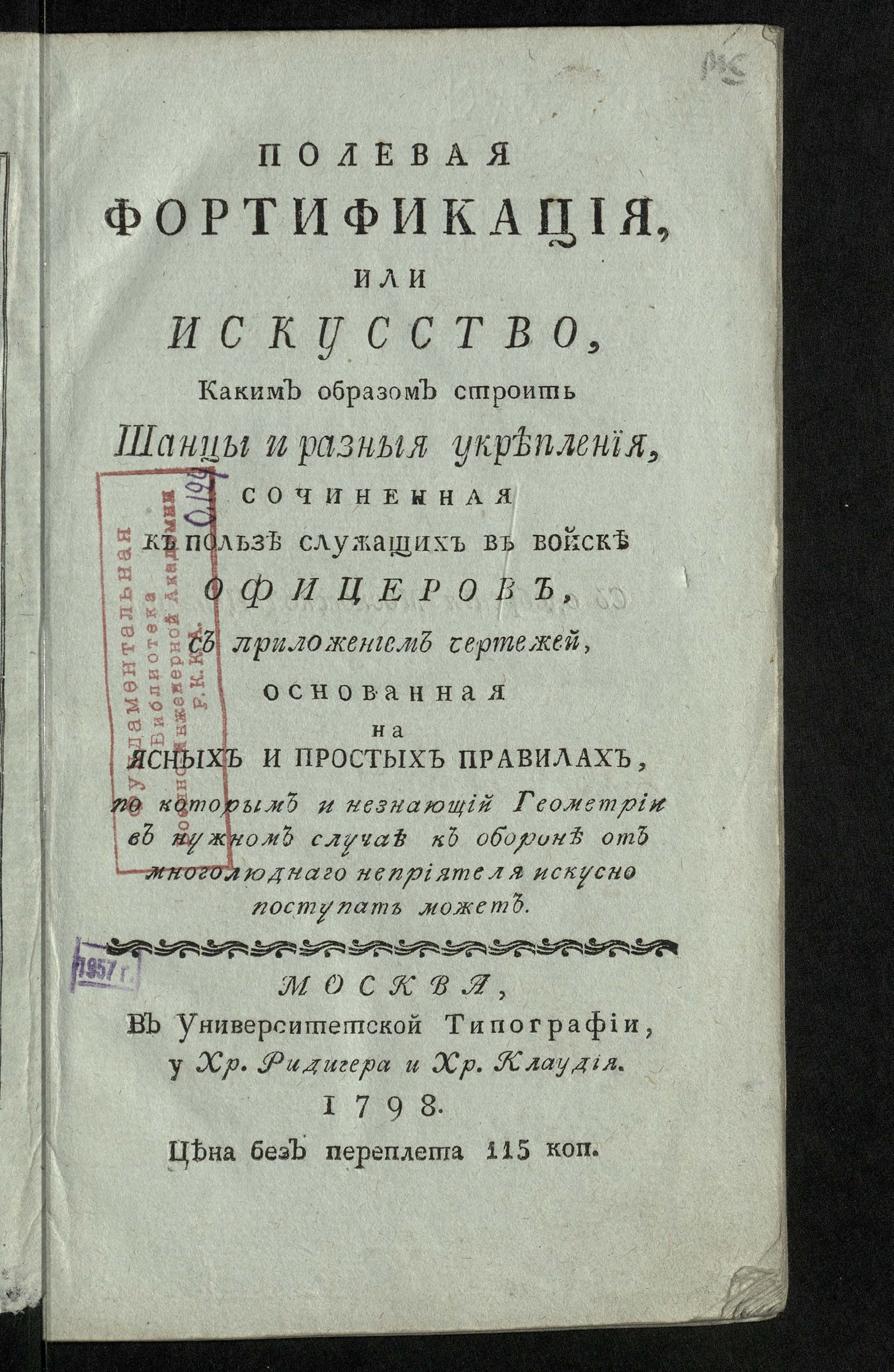 Сочиненная к пользе служащих в войске офицеров, : С приложением чертежей, : Основанная на ясных и простых правилах, по которым и незнающий геометрии в нужном случае к обороне от многолюднаго неприятеля искусно поступать может