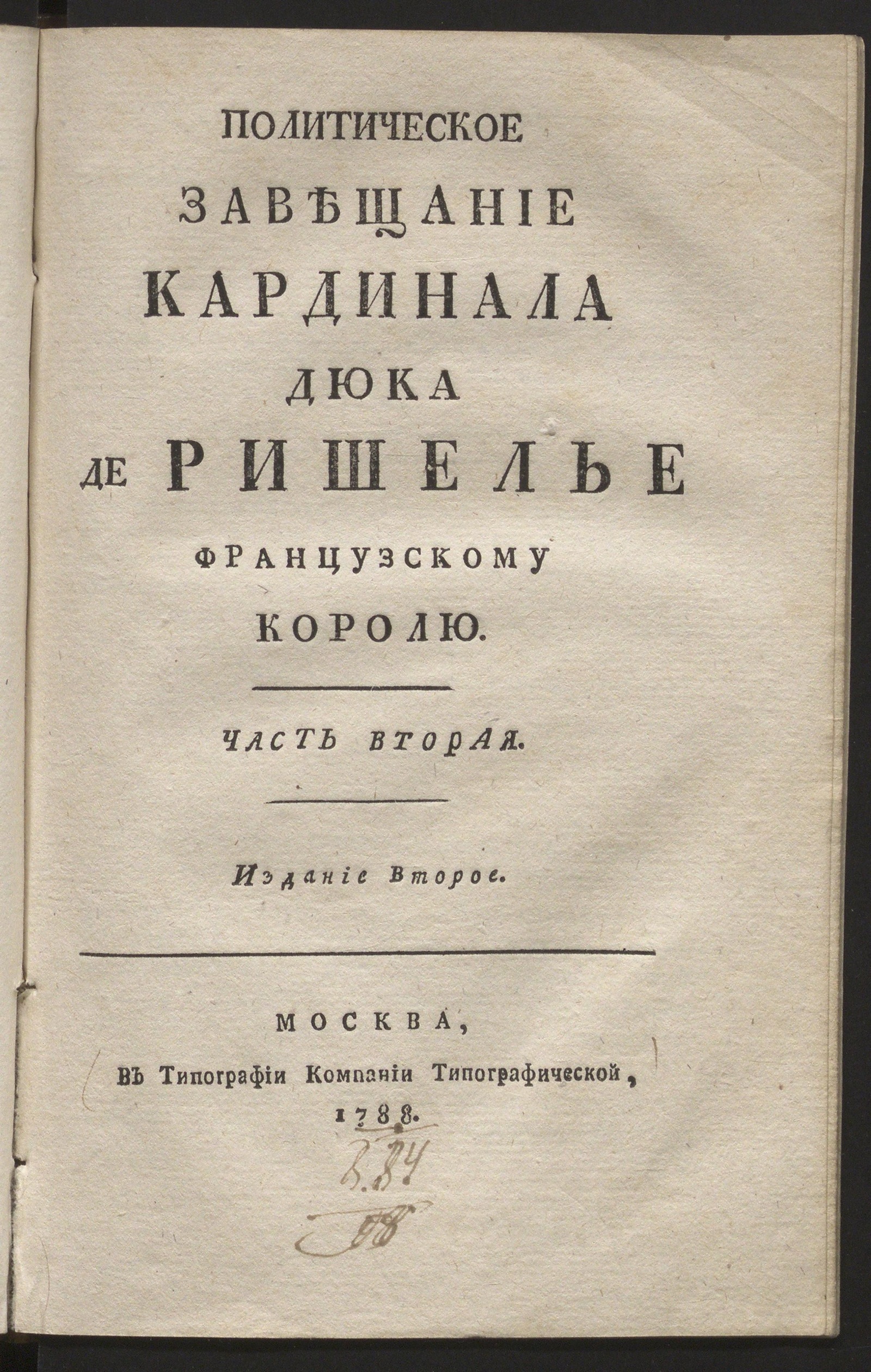 ИздательствоПолитическое завещание кардинала дюка де Ришелье французскому королю. Ч. 2. — Издание второе