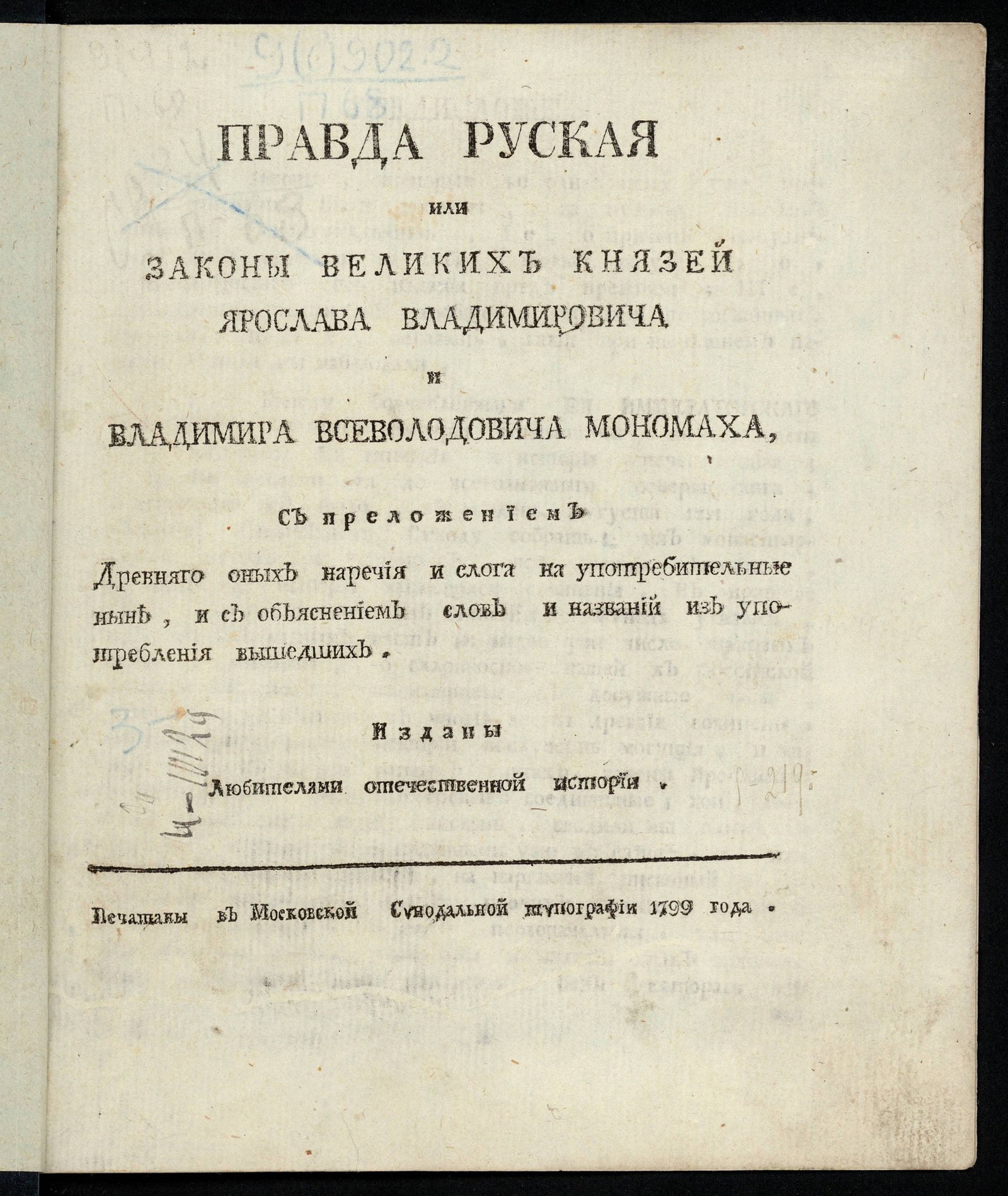 ИздательствоПравда руская или Законы великих князей Ярослава Владимировича и Владимира Всеволодовича Мономаха: С приложением древняго оных наречий и слога на употребительные ныне, и с объяснением слов и названий из употребления вышедших / Изданы любителями отечественной истории