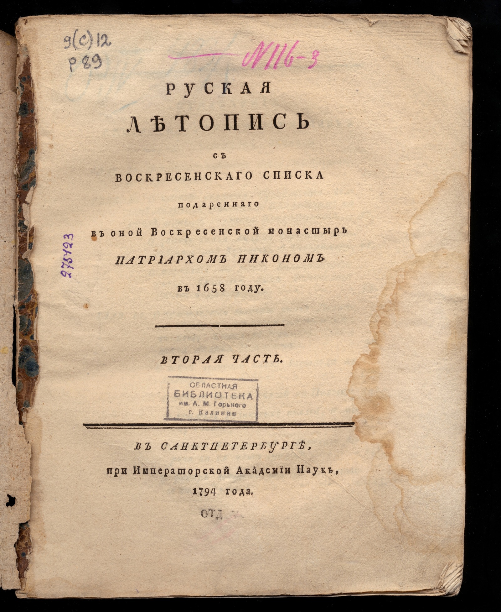 ИздательствоРуская летопись с Воскресенскаго списка подареннаго в оной Воскресенской монастырь патриархом Никоном в 1658 году: [ч. 1-2]. Ч. 2